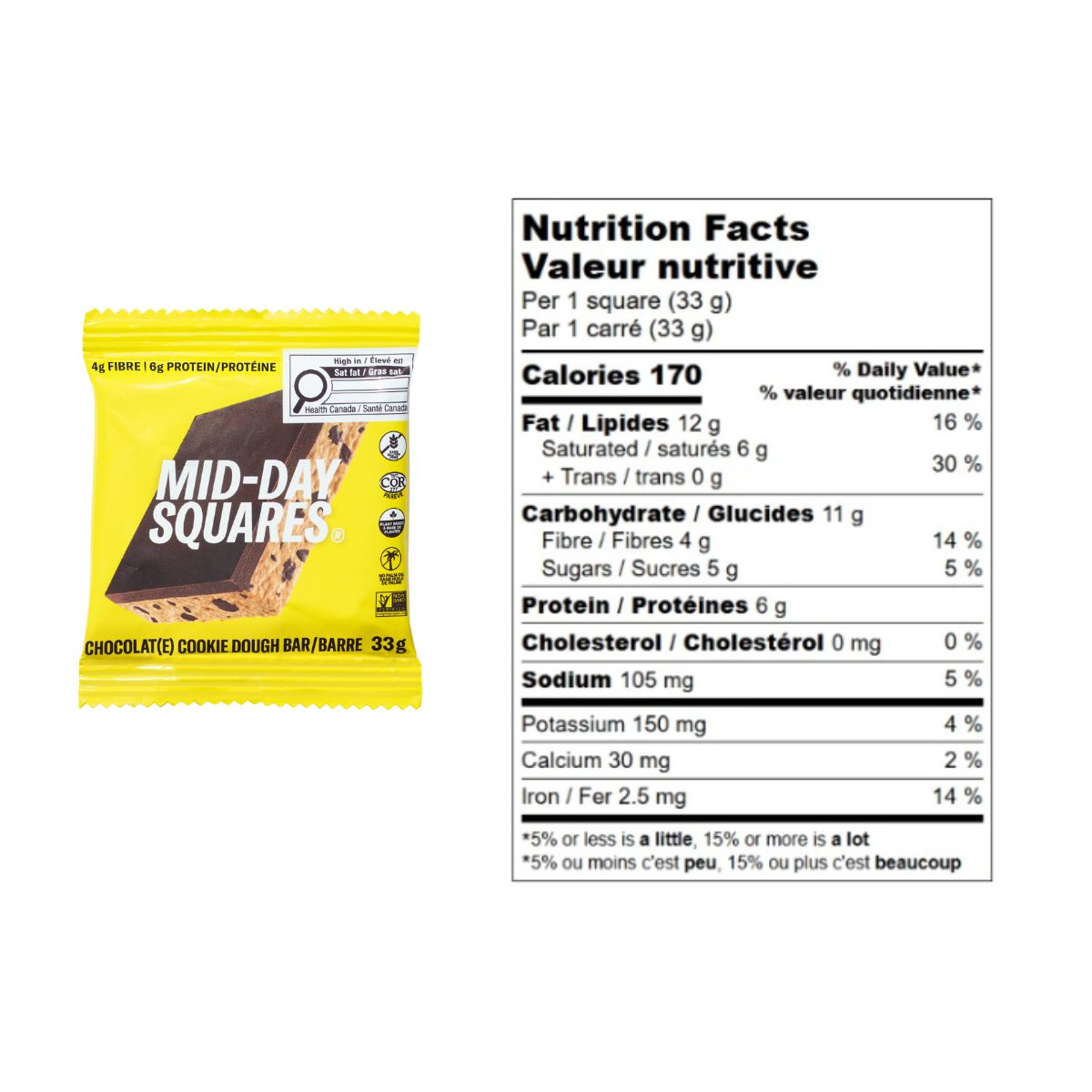 Mid-Day Squares Plant-Based Chocolate Bar Cookie Dough - Dark chocolate (unsweetened chocolate, cocoa butter, alkalized cocoa powder, coconut sugar, vanilla powder, sea salt), Sugars (maple syrup, organic apple juice concentrate, organic tapioca syrup, coconut sugar, organic molasses), Organic fava bean protein, Olive oil, Organic carob protein, Jerusalem artichoke fiber, Shea butter, Cocoa butter, Unsweetened chocolate, Alkalized cocoa powder, Coconut oil, Vanilla extract, Organic gluten Free oat flour, Organic apple cider vinegar, Rice bran butter and/or Cashew butter, Water, Sea salt, Okra powder, Rice bran extract. Contains: Cashews. May Contain: Peanuts, Other tree nuts, Sesame.