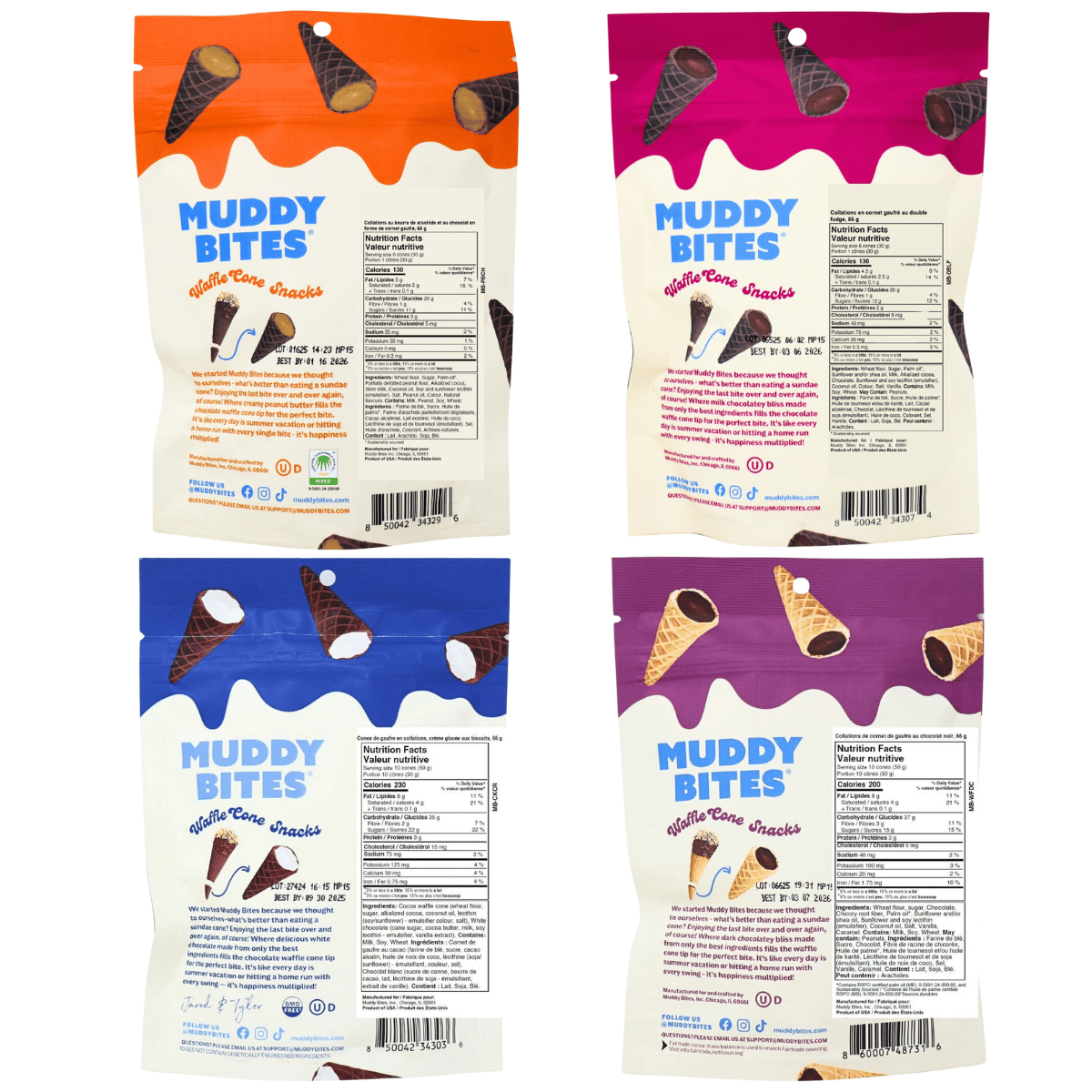 Four flavours. One variety pack. All the fun of the bottom-of-the-cone bite in a snackable treat you can enjoy anytime. The Muddy Bites Waffle Cone Snacks Variety Pack gives you a crunchy sampler of four bestselling flavours in one convenient 4-pack.