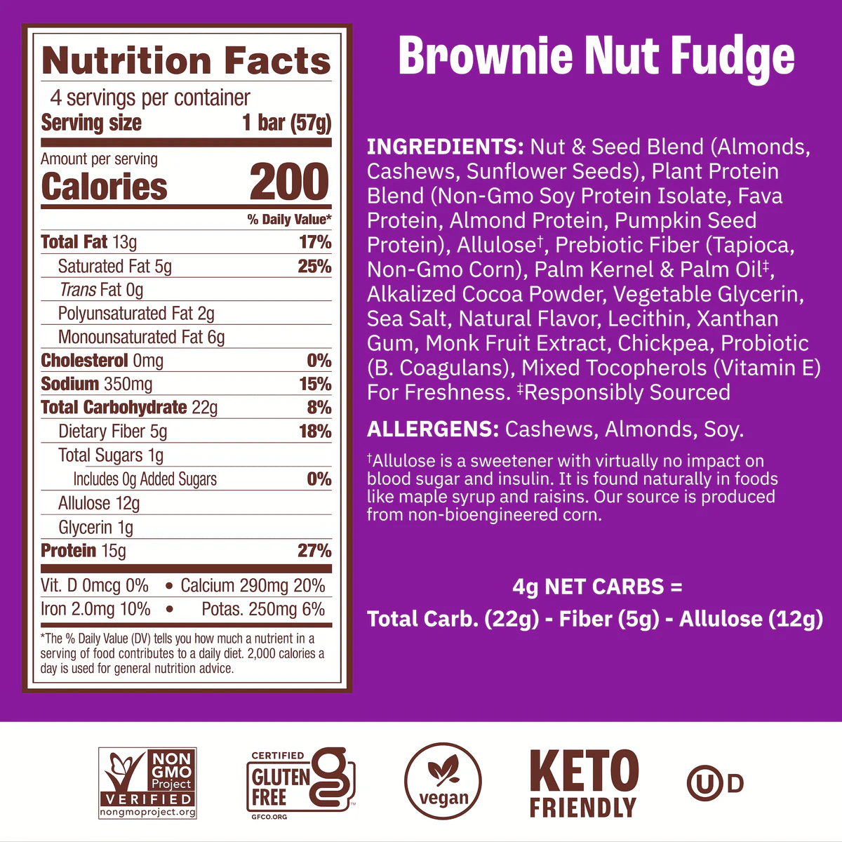 Nut & seed blend (Almonds, cashews, sunflower seeds), Plant protein blend (Non-GMO soy protein isolate, fava protein, almond protein, pumpkin seed protein), Allulose, Prebiotic fiber (Tapioca, non-GMO corn), Palm kernel & palm oil, Alkalized cocoa powder, Vegetable glycerin, Sea salt, Natural flavor, Lecithin, Xanthan gum, Monk fruit extract, Chickpea, Probiotic (B. coagulans), Mixed tocopherols (Vitamin E) for freshness.