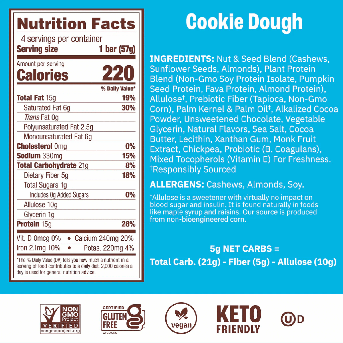 Nut & seed blend (Cashews, sunflower seeds, almonds), Plant protein blend (Non-GMO soy protein isolate, pumpkin seed protein, fava protein, almond protein), Allulose, Prebiotic fiber (Tapioca, non-GMO corn), Palm kernel & palm oil, Alkalized cocoa powder, Unsweetened chocolate, Vegetable glycerin, Natural flavors, Sea salt, Cocoa butter, Lecithin, Xanthan gum, Monk fruit extract, Chickpea, Probiotic (B. coagulans), Mixed tocopherols (Vitamin E) for freshness.