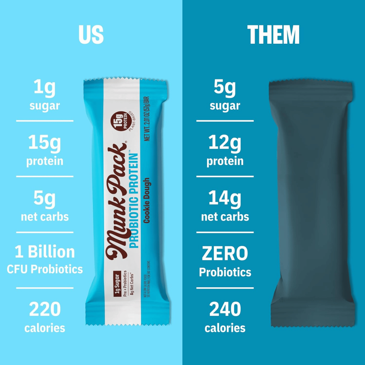 Enjoy the bakery taste of cookie dough with the benefits of plant-based protein and probiotics. Munk Pack Cookie Dough Probiotic Protein Bar offers that cookie dough chocolate coated crunch that supports digestion and sustained energy throughout your day.
