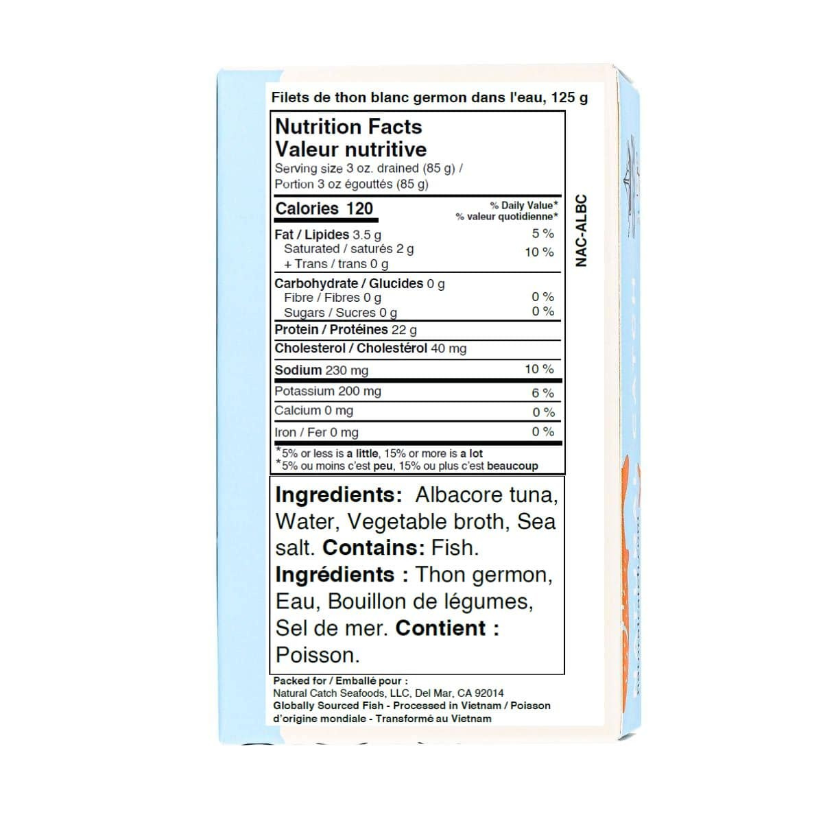 Albacore Tuna, Water, Vegetable Broth, Sea Salt.