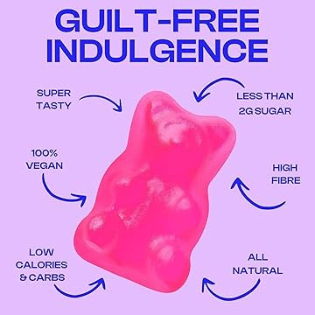 Soluble fibre (from corn or wheat), Oligofructose, Pectin, Erythritol, Vegetable glycerine, Citric acid, Malic acid, Sodium citrate, Concentrated black carrot juice (for colour), Natural flavourings, Coconut oil, Stevia leaf extract, Corn starch, Carnauba wax.