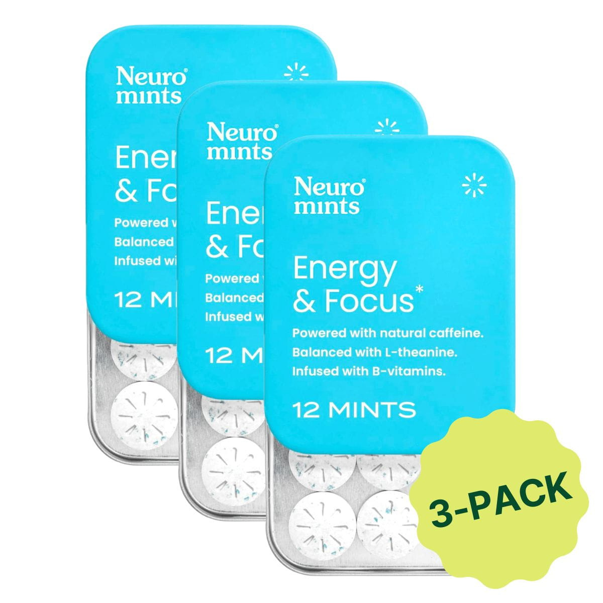3 individual packs of Neuro Energy & Focus Caffeinated Mints Peppermint, 12 Mints each