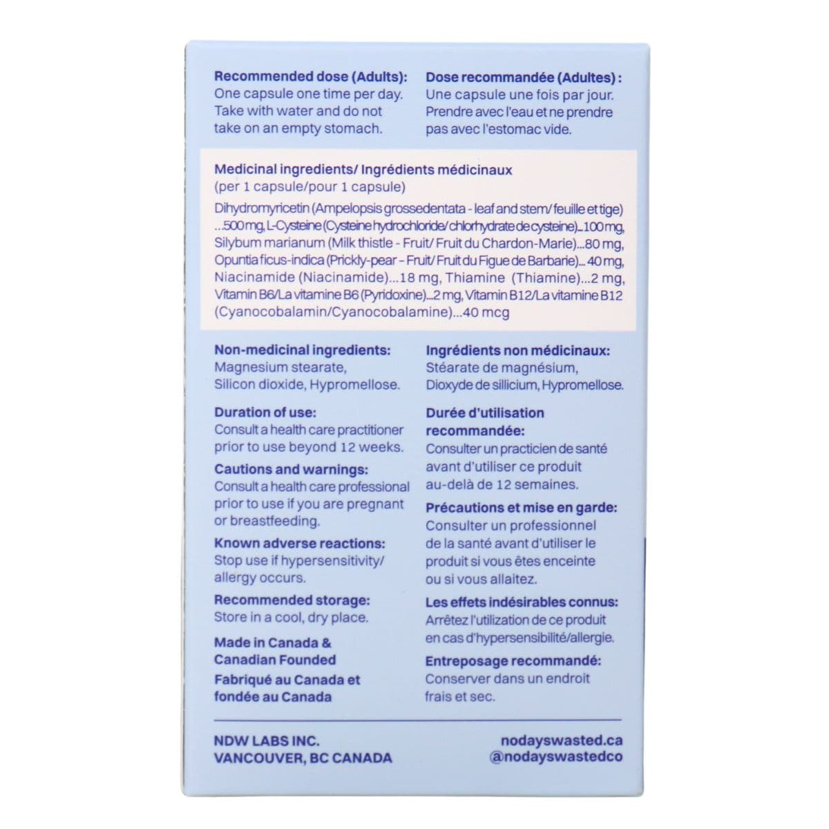 Medicinal Ingredients: Dihydromyricetin (Ampelopsis grossedentata – leaf and stem), L-cysteine (Cysteine hydrochloride), Silybum marianum (Milk thistle – fruit), Opuntia ficus-indica (Prickly-pear – fruit), Niacinamide, Thiamine, Vitamin B6 (Pyridoxine), Vitamin B12 (Cyanocobalamin).
