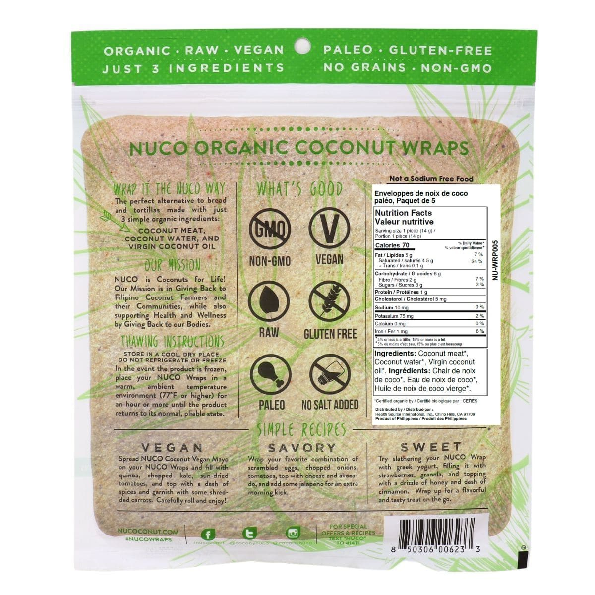 **Please note: During the winter, your NUCO wrap may arrive frozen--they're still fresh, and just need to be thawed! The Unrefined Virgin Coconut Oil in NUCO Wraps hardens in colder temperatures. Just place your wraps in the sun, or submergge the package in hot water for a few minutes to melt the coconut oil and make the wraps flexible again!