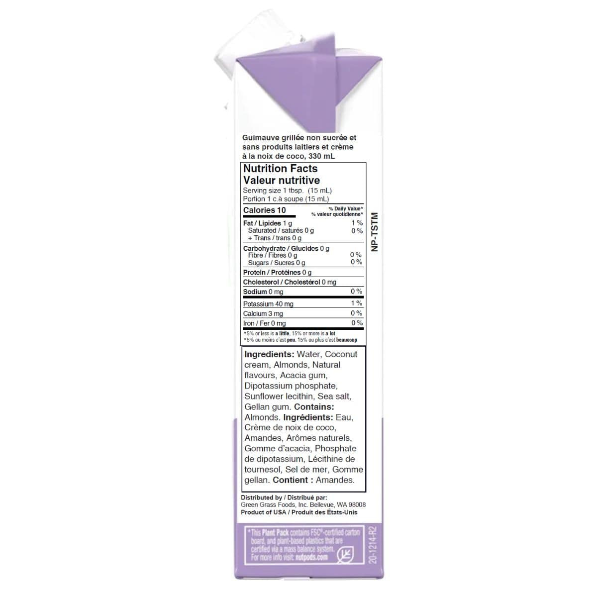 Water, Coconut cream, Almonds, Natural flavors, Acacia gum, Dipotassium phosphate, Sunflower lecithin, Sea salt, Gellan gum. Contains: Almonds.