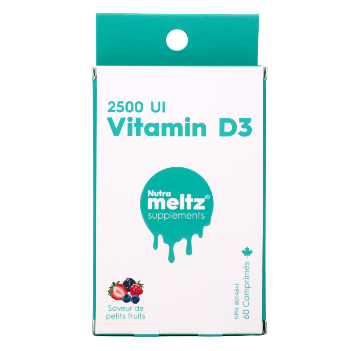 Strong bones. Immune support. Simple to take. Nutrameltz Vitamin D3 2500 IU delivers an essential daily boost in a smooth mixed berry-flavoured melt-away tablet that dissolves in seconds without water or swallowing required. It’s a convenient way to help maintain optimal vitamin D levels year-round.