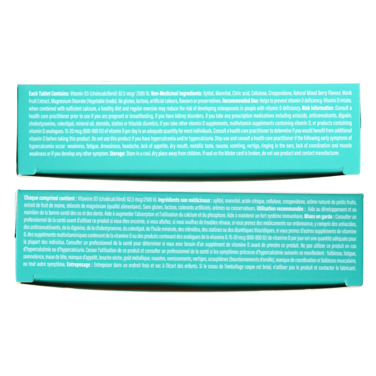 Medicinal Ingredients (per 1 tablet): Vitamin D3 (cholecalciferol) 62.5 mcg/2500 IU.
