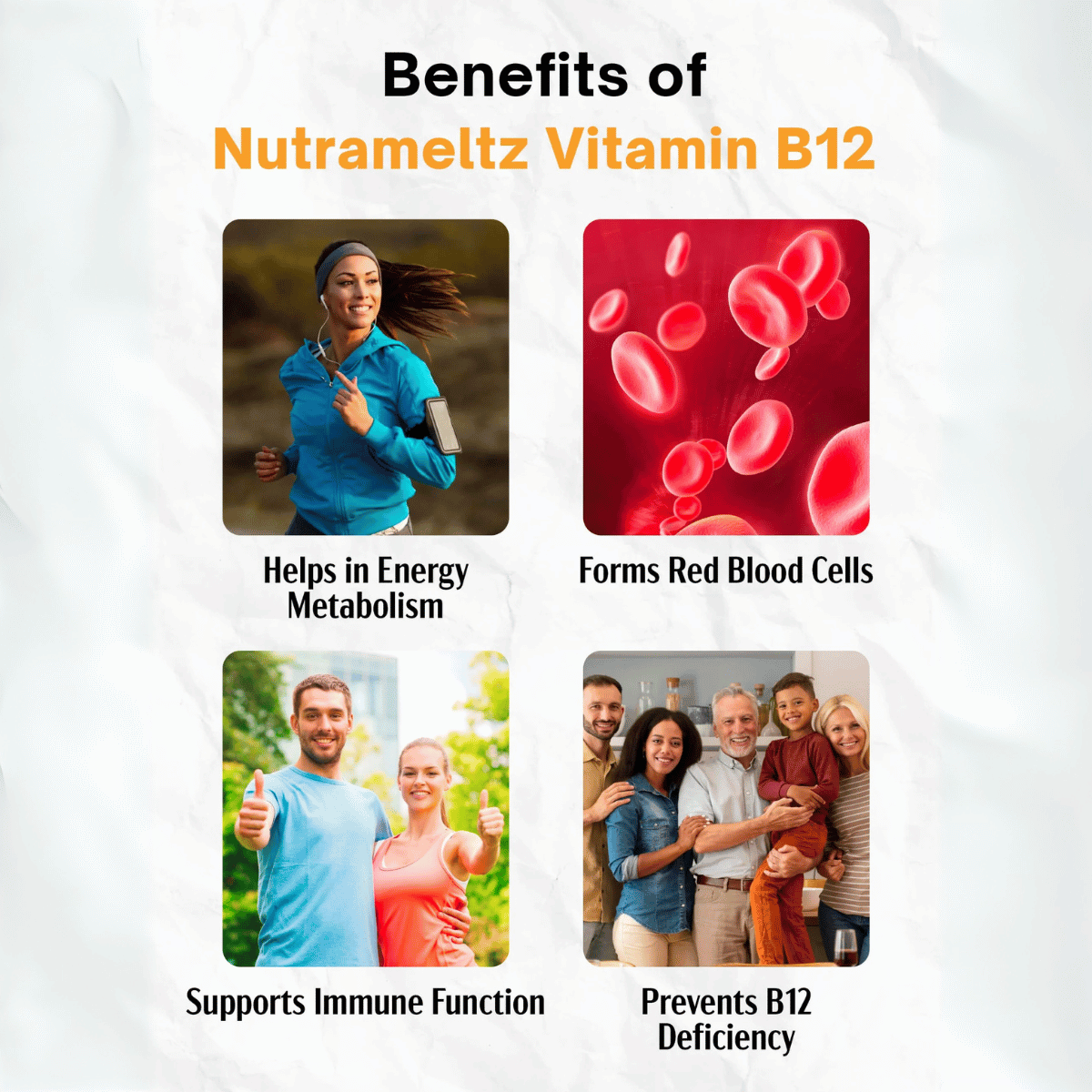 Nutrameltz Vitamin B12 Max delivers 5000 mcg of methylcobalamin, a bioavailable form of B12, in a quick-dissolving strawberry and kiwi-flavoured melt-away tablet that works without water. It’s a powerful daily boost you can take at home, at work, or on the go.