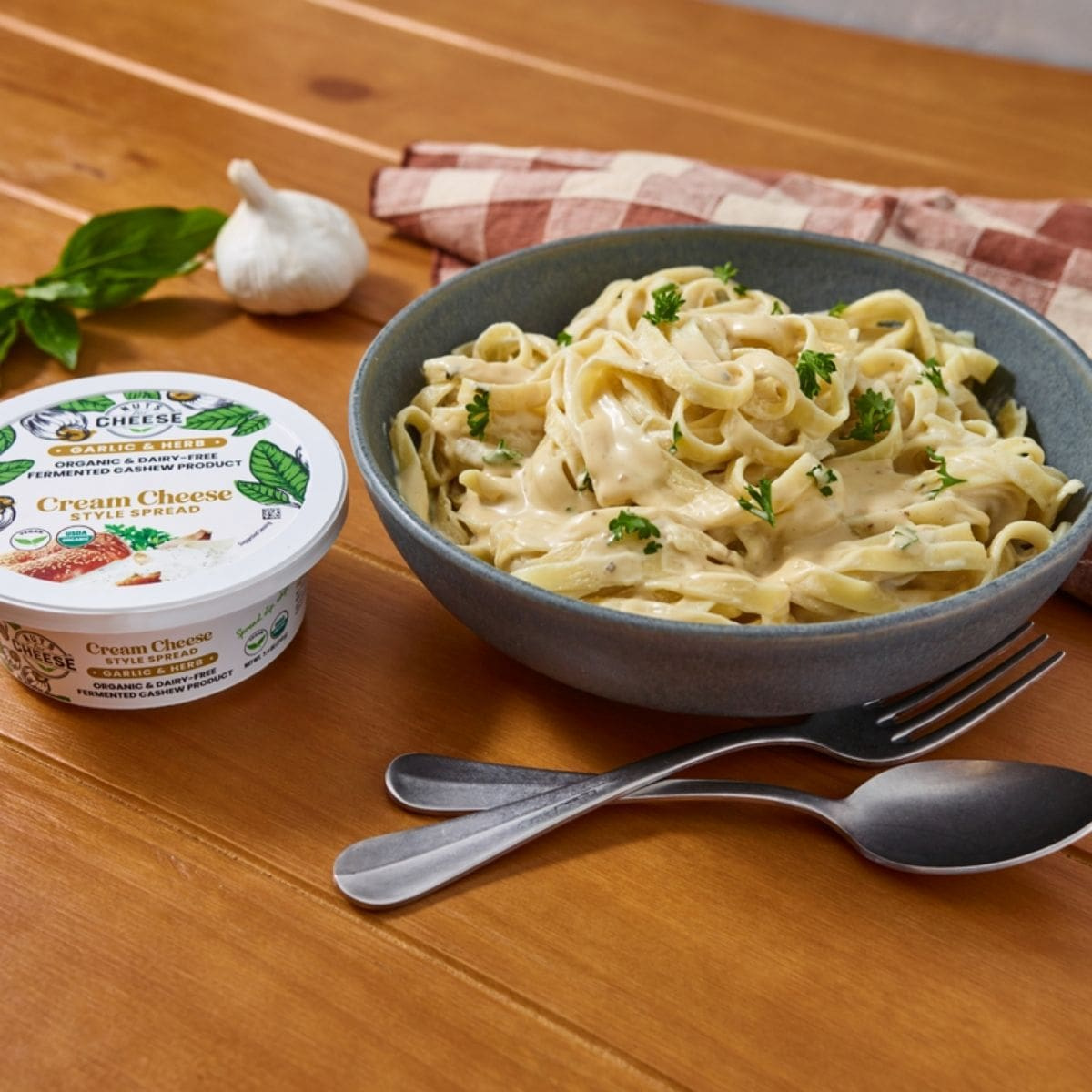 The texture is smooth and velvety, easy to spread onto bagels or stir into pasta sauces and dips. Every ingredient is simple and organic, so the herbs and cashews shine without distraction. It’s garlicky, plant-based, and completely dairy-free.