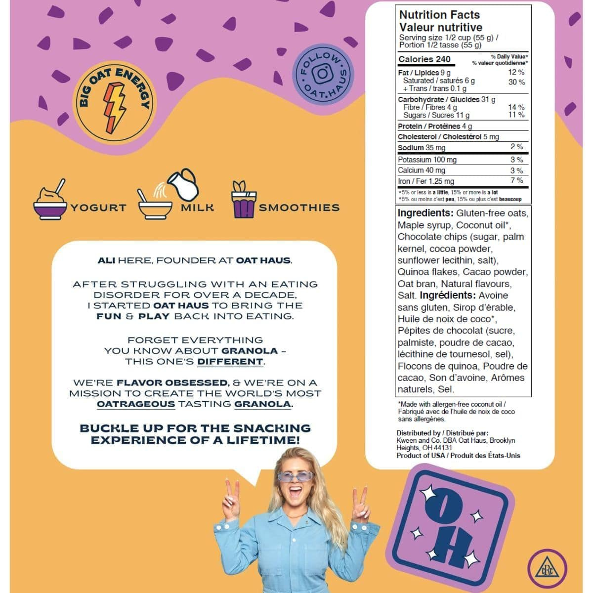 Ready for some instant brownie points? Oat Haus' Granola is here to satisfy your deepest, fudgiest cravings with rich cocoa, melt-in-your-mouth chocolate chips, and that straight-from-the-bowl brownie batter deliciousness. Made with simple ingredients like gluten-free oats, maple syrup, coconut oil, and of course, chocolate chips, this brownie batter chocolate granola is vegan, nut-free, dairy-free, and gluten-free, making it totally top 9 allergen free too! Inspired by their fan-favourite brownie batter granola butter, Oat Haus' granola is the sweet treat of your dreams! Batter up!