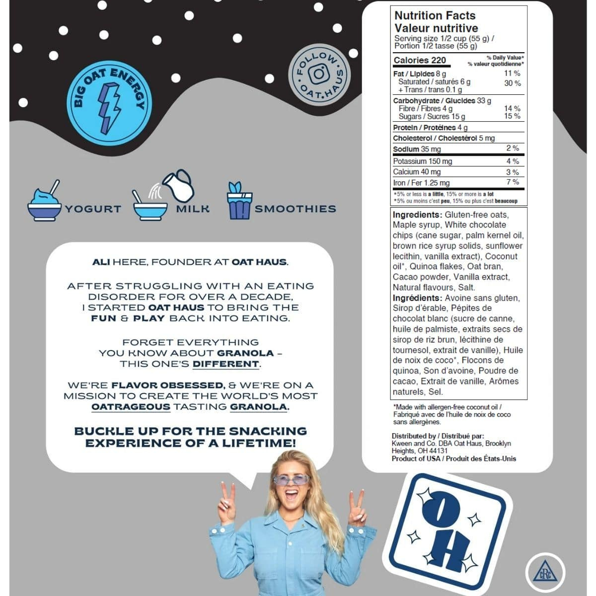 Stop the crumb-spiracy—cookies & cream isn’t just for ice cream anymore! Oat Haus' Cookies & Cream Granola is here to shake up snack time with the perfect cookie-crunch combo. Made in small batches but packing BIG flavour, this cookie granola is packed with rich cocoa and creamy hints of white chocolate for a crispy-crunchy bite that tastes just like dunking your favourite sandwich cookie in milk. With simple ingredients like gluten-free oats, maple sryup, coconut oil, and white chocolate chips, Oat Haus' granola is vegan, nut-free, gluten-free, and top 9 allergne-free, eleva everyone's favourite flavour combo to new snackable, munchable, can't-put-it-down heights!