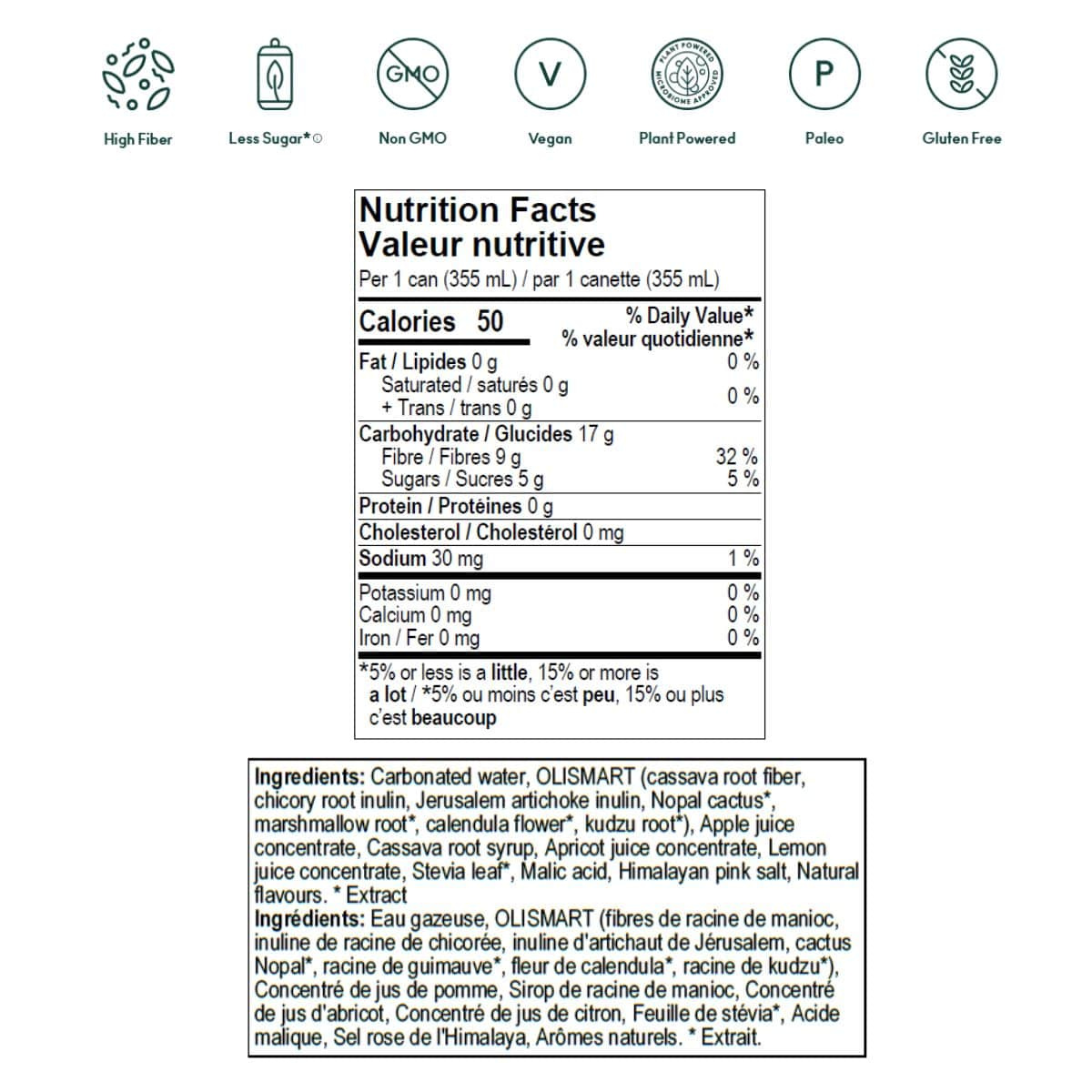 Carbonated Water, OLISMART (Cassava Root Fiber, Chicory Root Inulin, Jerusalem Artichoke Inulin, Nopal Cactus*, Marshmallow Root*, Calendula Flower*, Kudzu Root*), Apple Juice Concentrate, Cassava Root Syrup, Apricot Juice Concentrate, Lemon Juice Concentrate, Stevia Leaf*, Malic Acid, Himalayan Pink Salt, Natural Flavours.