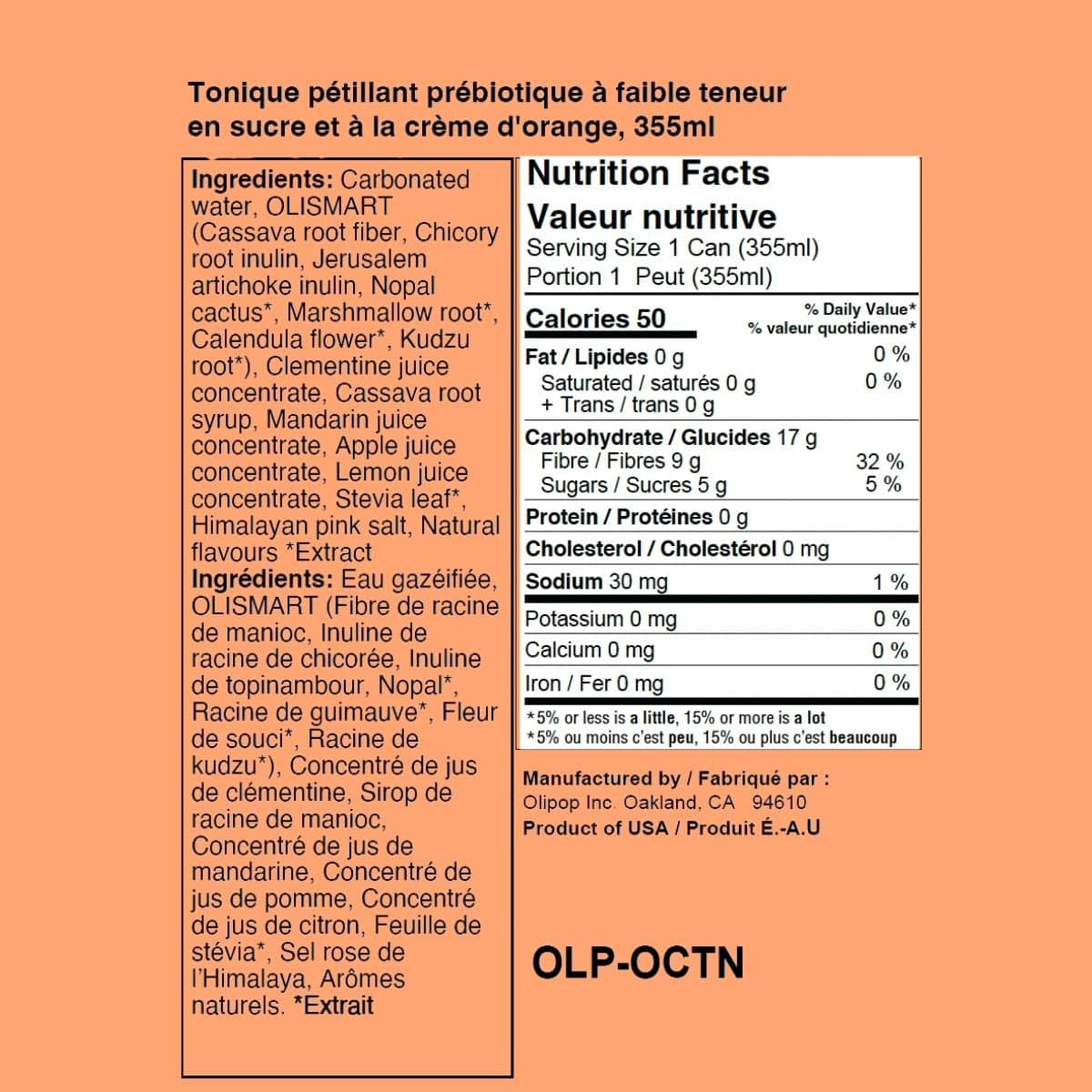 Carbonated water, OLISMART (Cassava root fiber, Chicory root inulin, Jerusalem artichoke inulin, Nopal cactus*, Marshmallow root*, Calendula flower*, Kudzu root*), Clementine juice concentrate, Cassava root syrup, Mandarin juice concentrate, Apple juice concentrate, Lemon juice concentrate, Stevia leaf*, Himalayan pink salt, Natural flavours *Extract