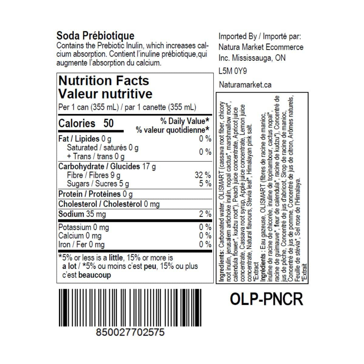 Carbonated Water, OLISMART (Cassava Root Fiber, Chicory Root Inulin, Jerusalem Artichoke Inulin, Nopal Cactus*, Marshmallow Root*, Calendula Flower*, Kudzu Root*), Peach Juice Concentrate, Apricot Juice Concentrate, Cassava Root Syrup, Apple Juice Concentrate, Lemon Juice Concentrate, Natural Flavours, Stevia Leaf*, Himalayan Pink Salt.