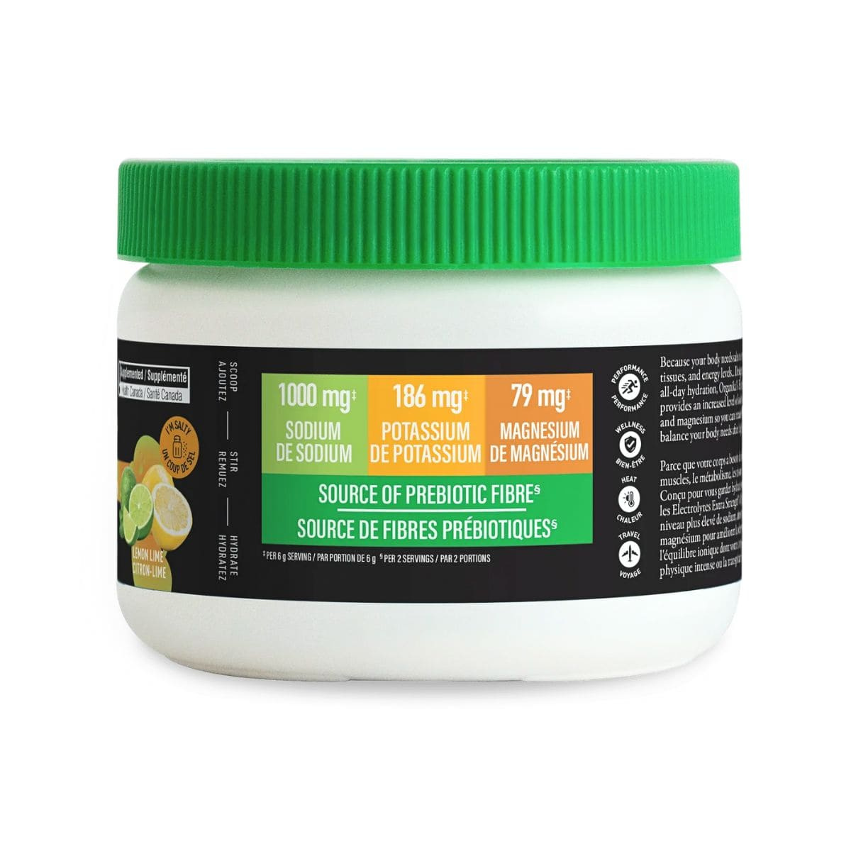 Sodium chloride, Citric acid, Prebiotic soluble vegetable fibre, Magnesium citrate, Potassium citrate, Natural lemon-lime flavour, Spirulina and apple concentrate (for colour), Stevia extract, Beta-carotene (for colour).