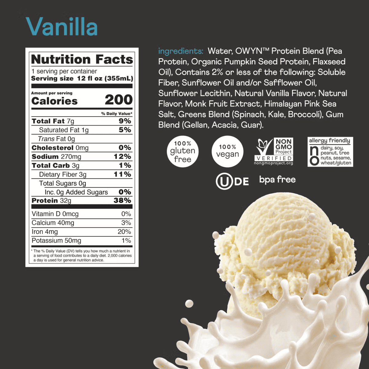 Water, OWYN™ protein blend (Pea protein, organic pumpkin seed protein, flaxseed oil), Contains 2% or less of the following: Soluble fibre, Sunflower oil and/or safflower oil, Sunflower lecithin, Natural vanilla flavour, Natural flavour, Monk fruit extract, Himalayan pink sea salt, Greens blend (Spinach, kale, broccoli), Gum blend (Gellan, acacia, guar).