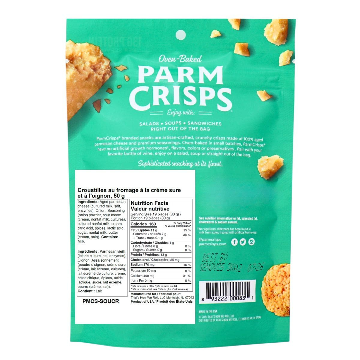 A classic chip flavoured turned keto with ParmCirsps sour cream & onion cheese crisps! You can now ditch the potato chips for this cheesy delight! Made with 100% aged parmesan cheese, these keto cheese crisps have 1g of net carbs, 13g of protein, and no gluten, grains, or sugar. Crispy and cheesy, these cheese crisps are oven-baked, not fried, and free of artificial hormones, flavours, colours, or preservatives for an all-around healthy snack!