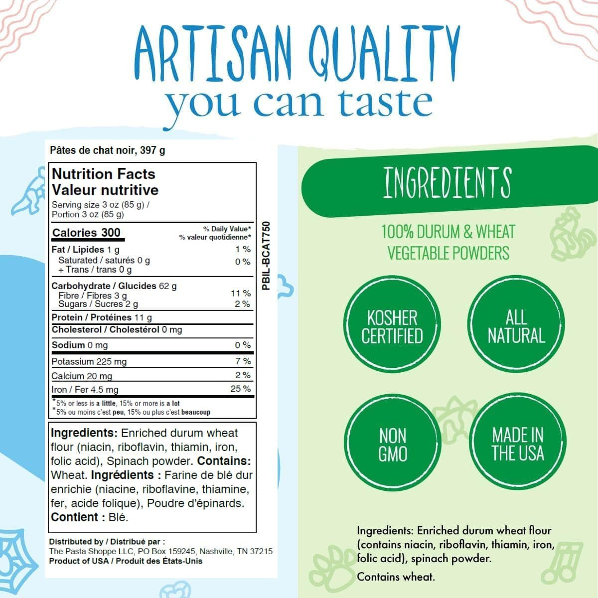 Pastabilities’ black cat pasta is a delicious, vegan pasta in adorable black cat shapes. Made with just two ingredients – enriched durum wheat flour and spinach powder, your kids will love the fun shapes, while you'll love the all-natural ingredients. It’s almost terrifyingly good!