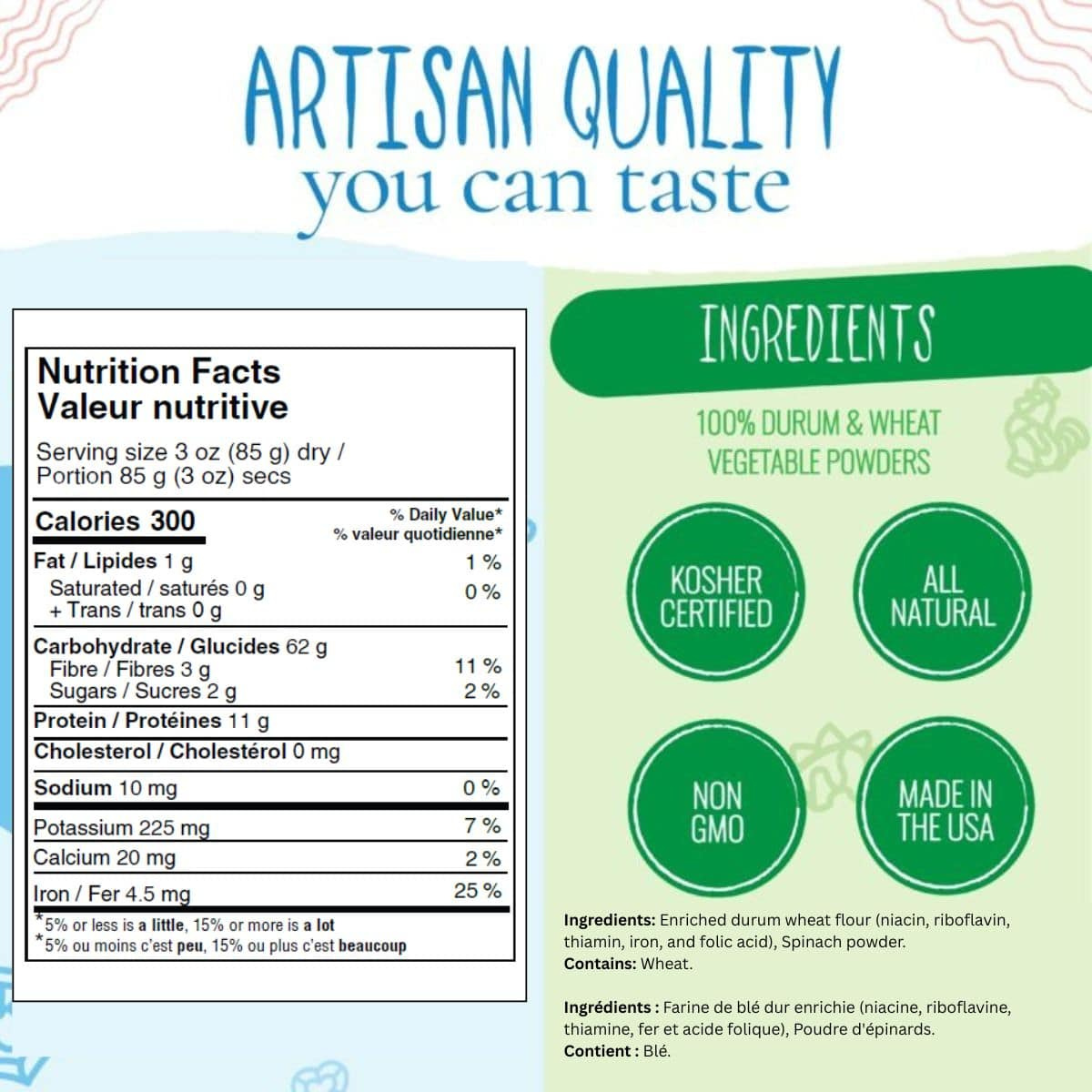 Enriched Durum Wheat Flour (contains niacin, riboflavin, thiamin, iron, and folic acid), Spinach Powder