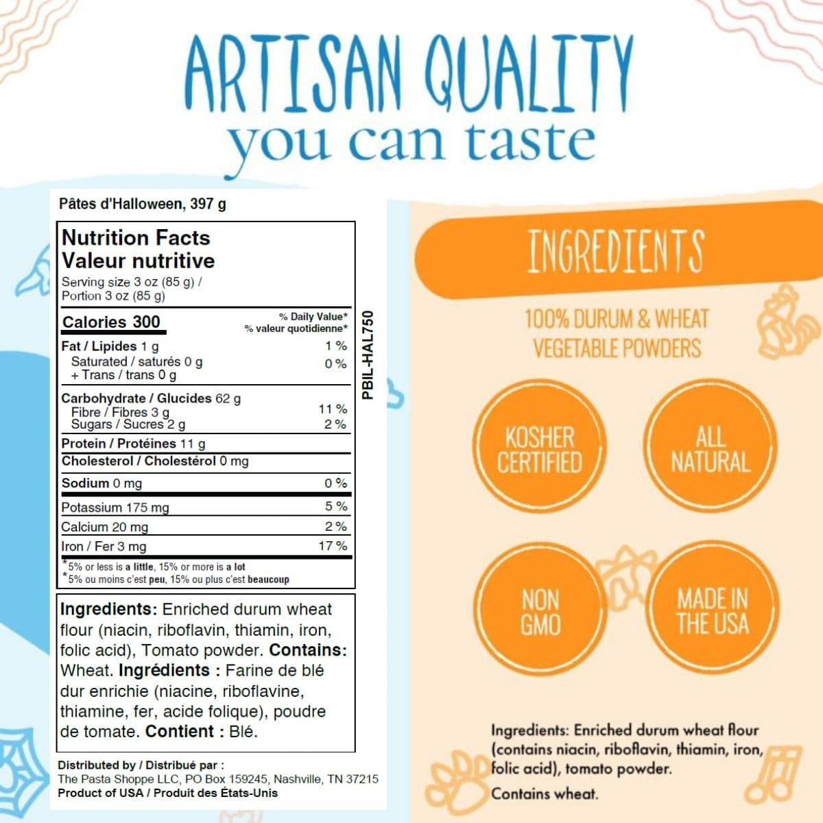 Why let the Halloween spirit stop at candy? Keep the spooky vibes going right to your dinner table with Pastabilities! With fun shapes like spooky spiders, ghostly ghouls, and cheeky pumpkins, this Halloween pasta is sure to make every meal frightfully delicious. Made with 100% durum wheat and naturally coloured with vegetable powder, there’s no tricks here–just a treat for both adults and kids alike! Whether you make a Halloween pasta salad or sauce it up for frightfully good feast, Pastabilities will have everyone screaming for more!
