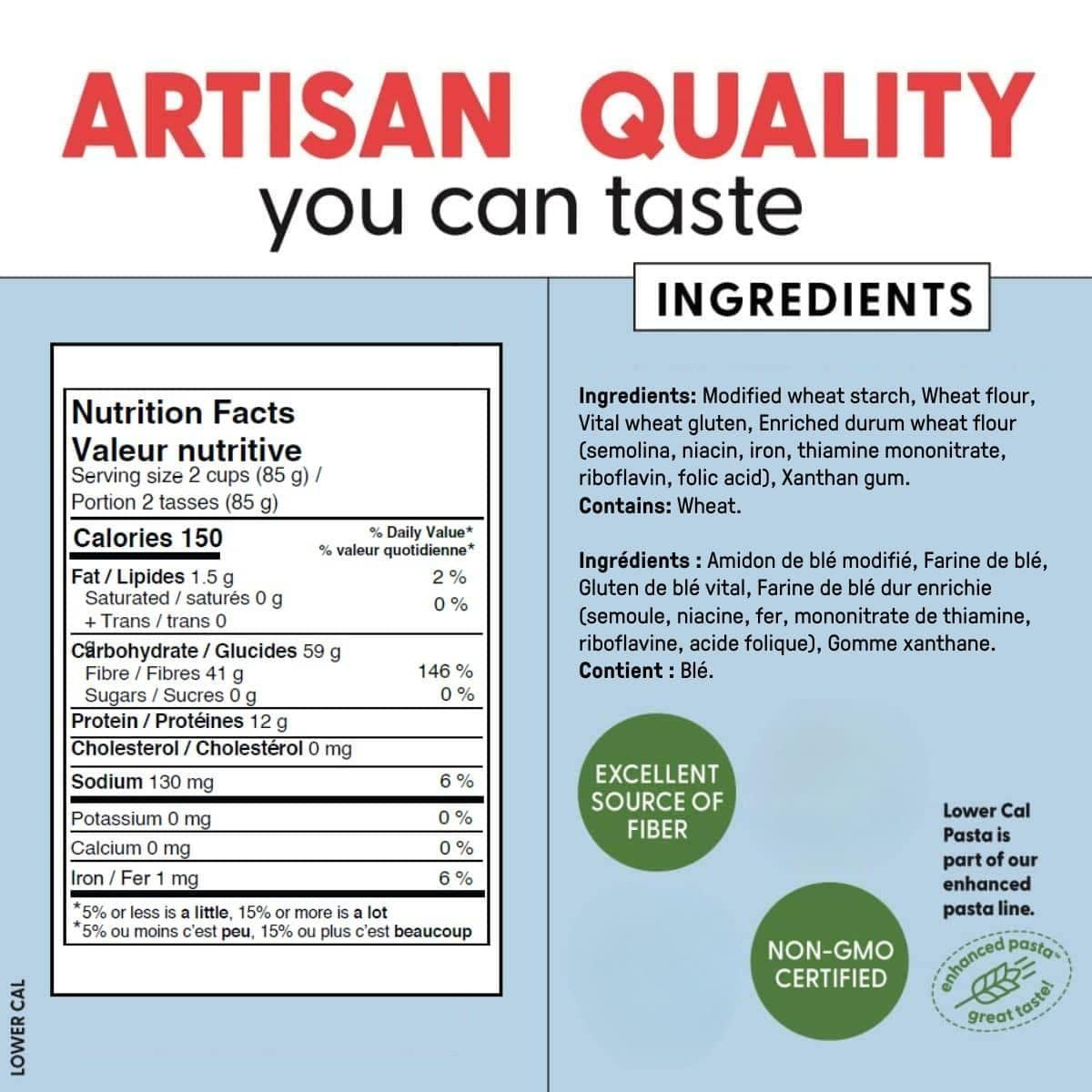 Modified wheat starch, Wheat flour, Vital wheat gluten, Enriched durum wheat flour (semolina, niacin, iron, thiamine mononitrate, riboflavin, folic acid), Xanthan gum