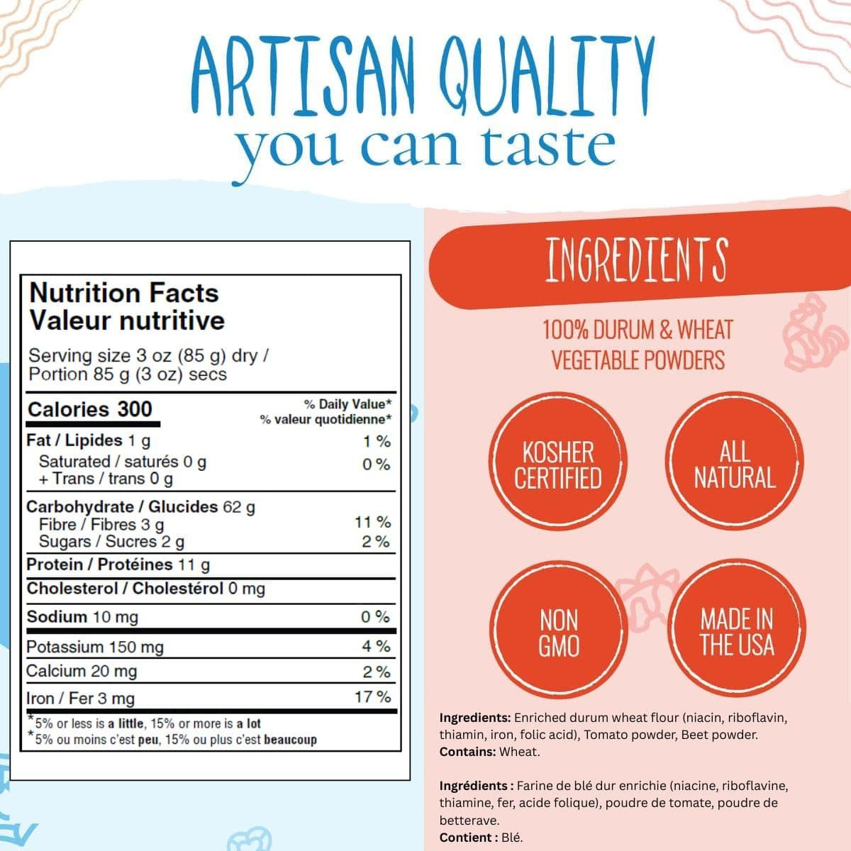 Enriched Durum Wheat Flour (Contains Niacin, Riboflavin, Thiamine, Iron, Folic Acid), Water, Tomato Powder, Beet Powder.