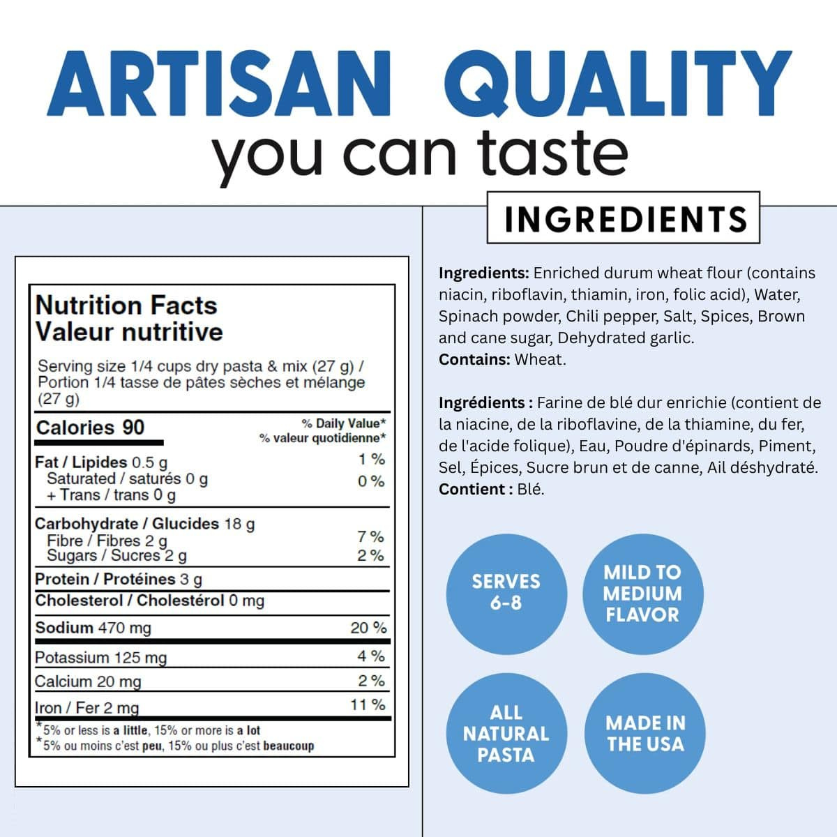 Enriched durum wheat flour (contains niacin, riboflavin, thiamin, iron, folic acid), Water, Spinach powder, Chili pepper, Salt, Spices, Brown and cane sugar, Dehydrated garlic