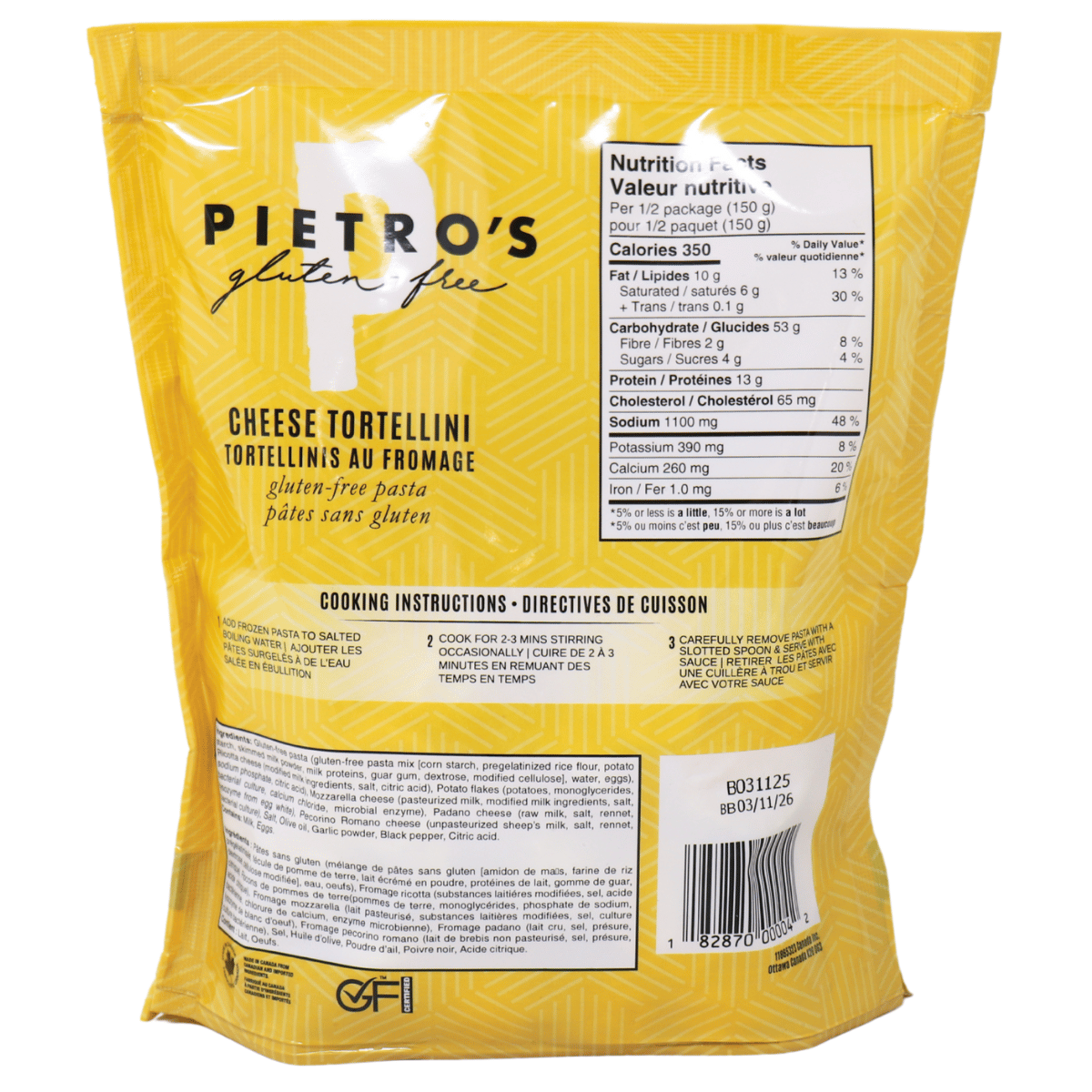 Pietro’s Gluten-Free Four Cheese Tortellini brings that same cheesy satisfaction to your table, without the wheat. These pasta pockets are stuffed with a creamy, savoury blend of real cheeses and wrapped in a tender gluten-free dough that holds its shape and cooks up just right. Whether you’re tossing them in butter and herbs or covering them in marinara, they make gluten-free pasta night easy and effortless in just minutes. Just boil, pair with your favourite topping & serve. No falling apart in the water, this gluten-free tortellini is ready to make it to the plate in one piece.