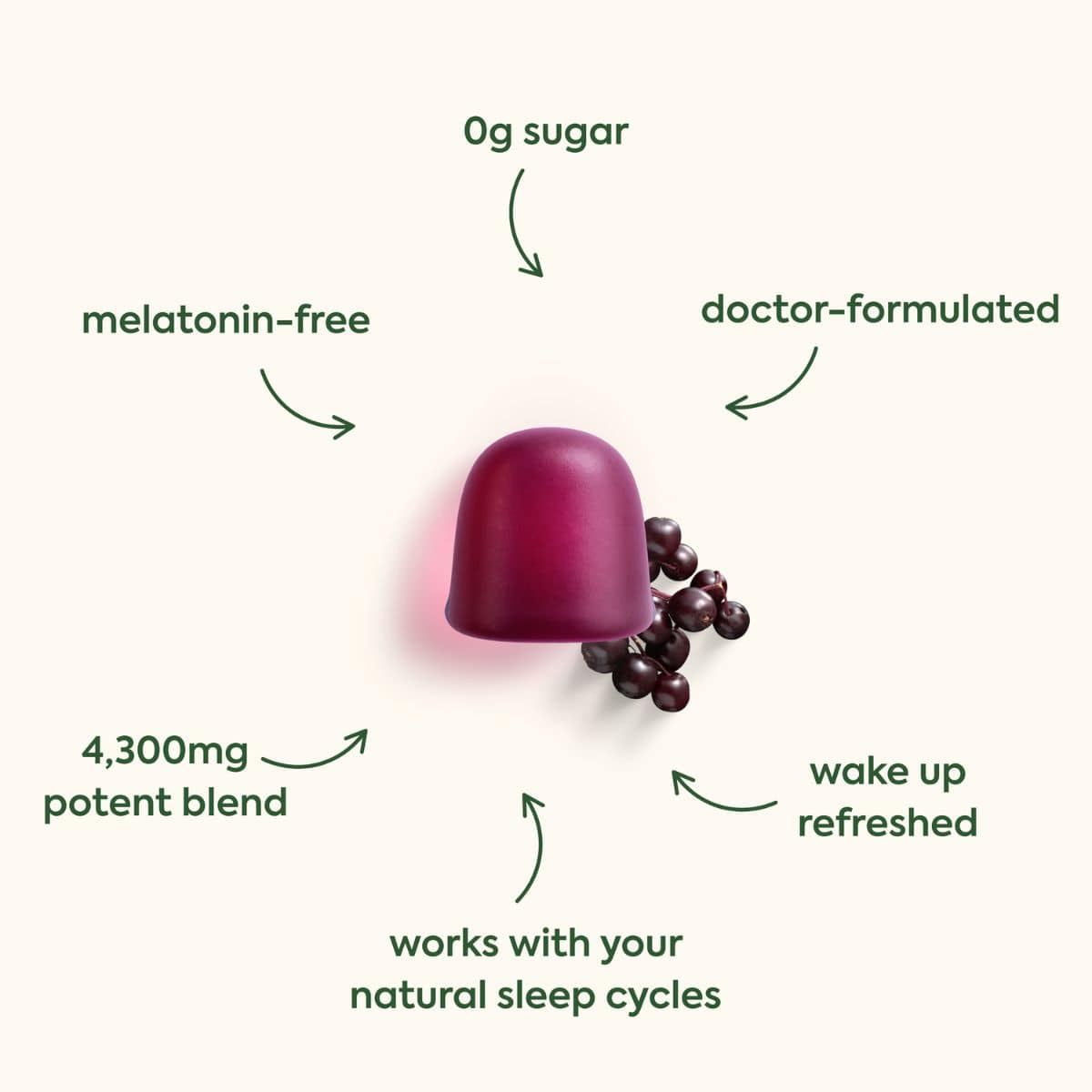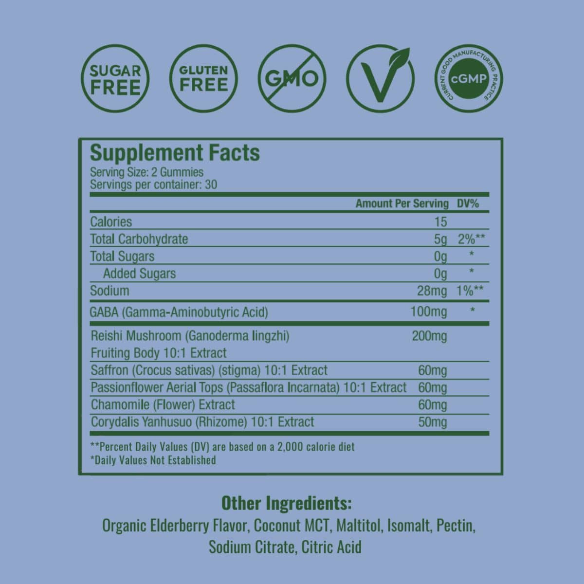 Reishi mushroom fruiting body (Ganoderma lingzhi) †, GABA (Gamma-aminobutyric acid), Saffron (Crocus sativas) (stigma) †, Passionflower (Passiflora incarnata) †, Chamomile flower (Matricaria chamomillia) †, Corydalis yanhusuo (rhizome) †. Other ingredients: Organic elderberry flavour, Coconut MCT, Maltitol, Isomalt, Pectin, Sodium citrate, Citric acid.