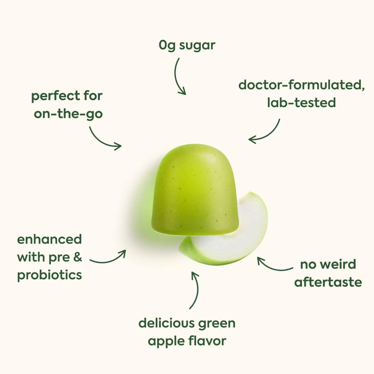 Each green apple-flavoured bite delivers a powerhouse blend of six super greens. Kale, spinach, broccoli, spirulina, chlorella and more! Plus there’s vitamin D3 and a whopping 100 billion CFUs of gut-loving prebiotics and probiotics. It's like a daily green juice, minus the blender and the bitter aftertaste.