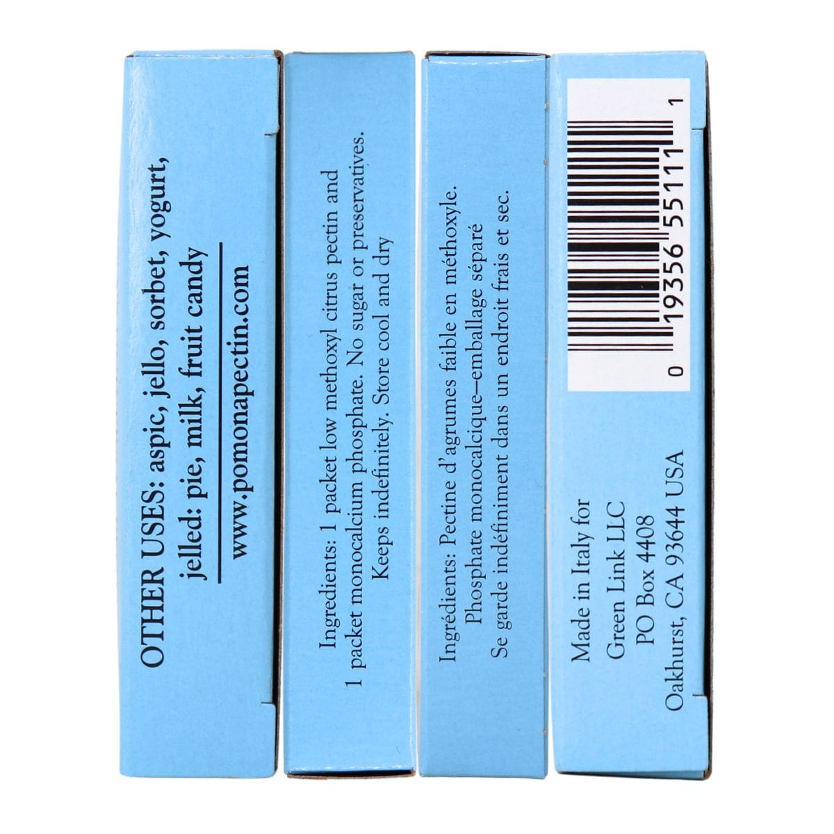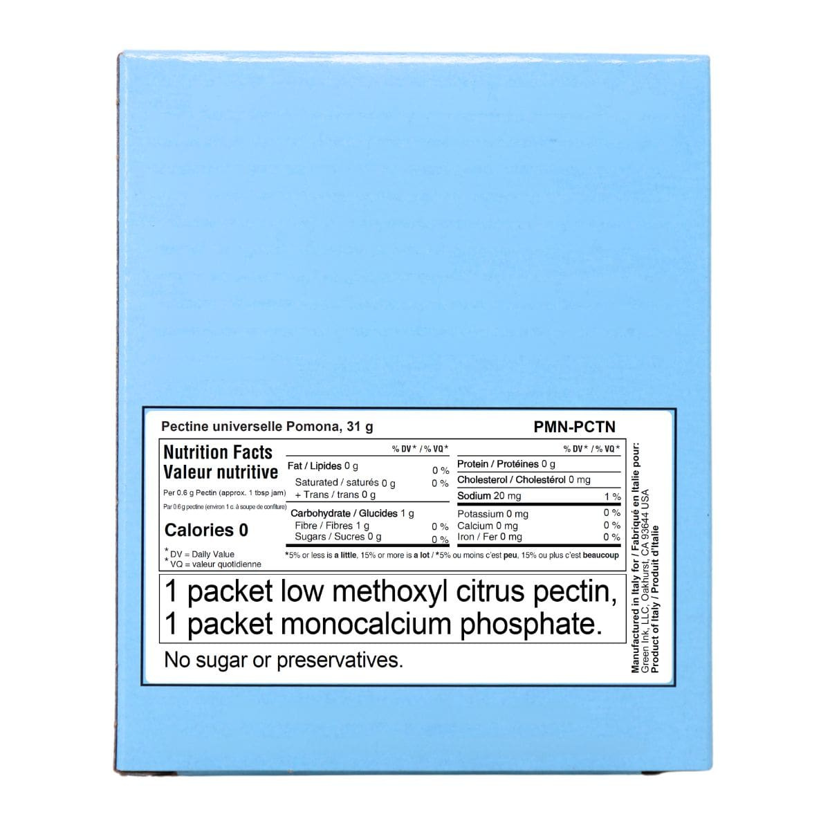 1 packet low methoxyl citrus pectin, 1 packet monocalcium phosphate. No sugar or preservatives.