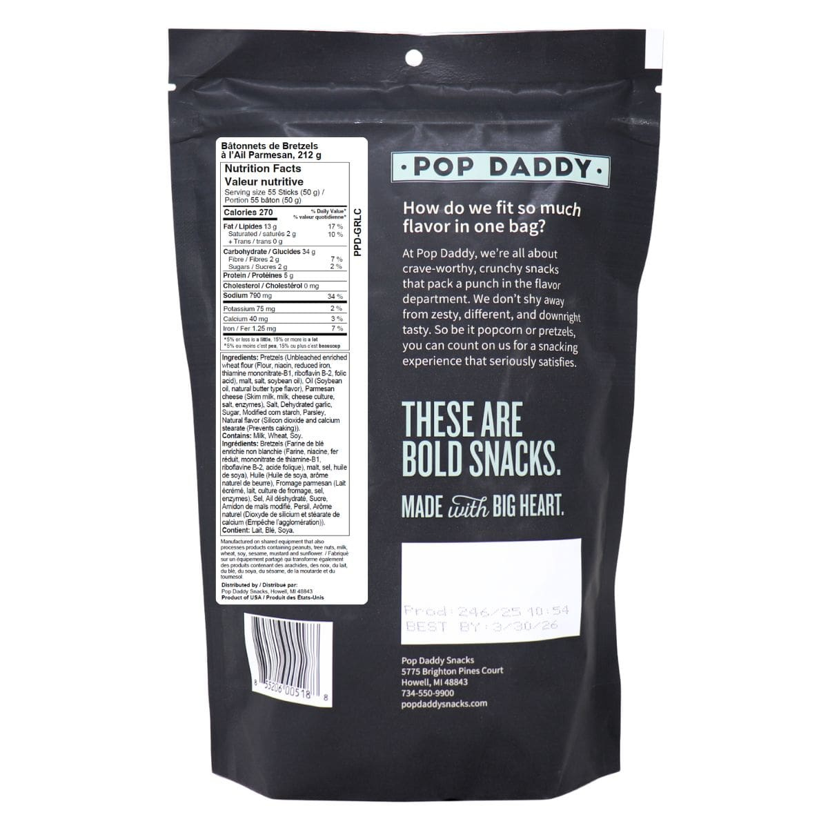 Warm, savoury, and incredibly snackable, these garlic parmesan pretzel sticks bring a bold hit of seasoning with a crispy crunch. Pop Daddy Garlic Parmesan Pretzel Sticks start with a crisp pretzel base and layer it with a rich garlic profile and salty parmesan-style seasoning that makes every handful feel extra satisfying.Â