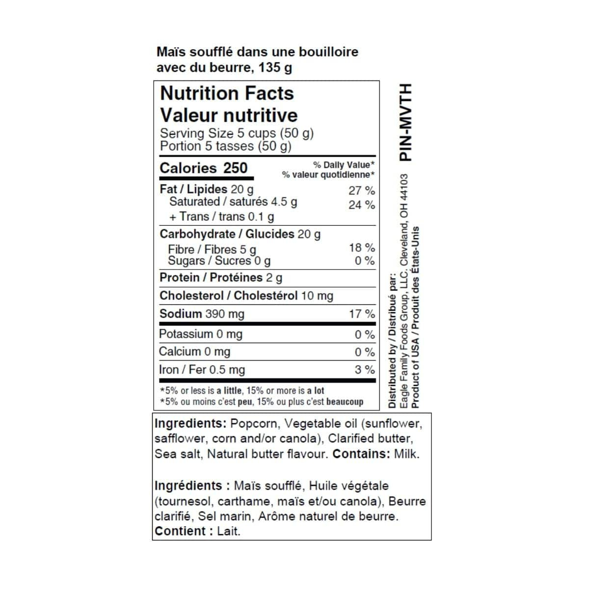 Popcorn, Vegetable Oil (Sunflower, Safflower, Corn And/Or Canola), Clarified Butter, Sea Salt, Natural Butter Flavour