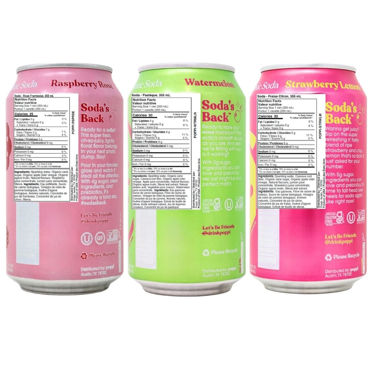 Poppi Prebiotic Soda Watermelon, 355ml - Sparkling water, Organic cane sugar, Cassava root fiber, Organic apple cider vinegar, Apple juice*, Natural flavours, Organic agave inulin, Stevia leaf extract, Natural tartaric acid, Vegetable juice (colour), Watermelon juice*. *concentrate