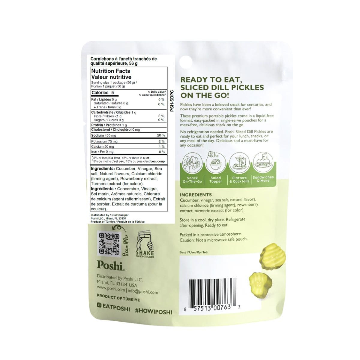 In a snacking pickle? Not any more! With Poshi's sliced kosher dill pickles, you get mess-free snacking pickles that you can take on the go with you, whenever and wherever! Brine-free and liquid-free, these thickly sliced pickles are crisp, crunchy, and packed with bold, tangy flavour. With no added sugar and only 6 calories for the whole pouch, these ready to eat pickle chips are a big 'dill'!