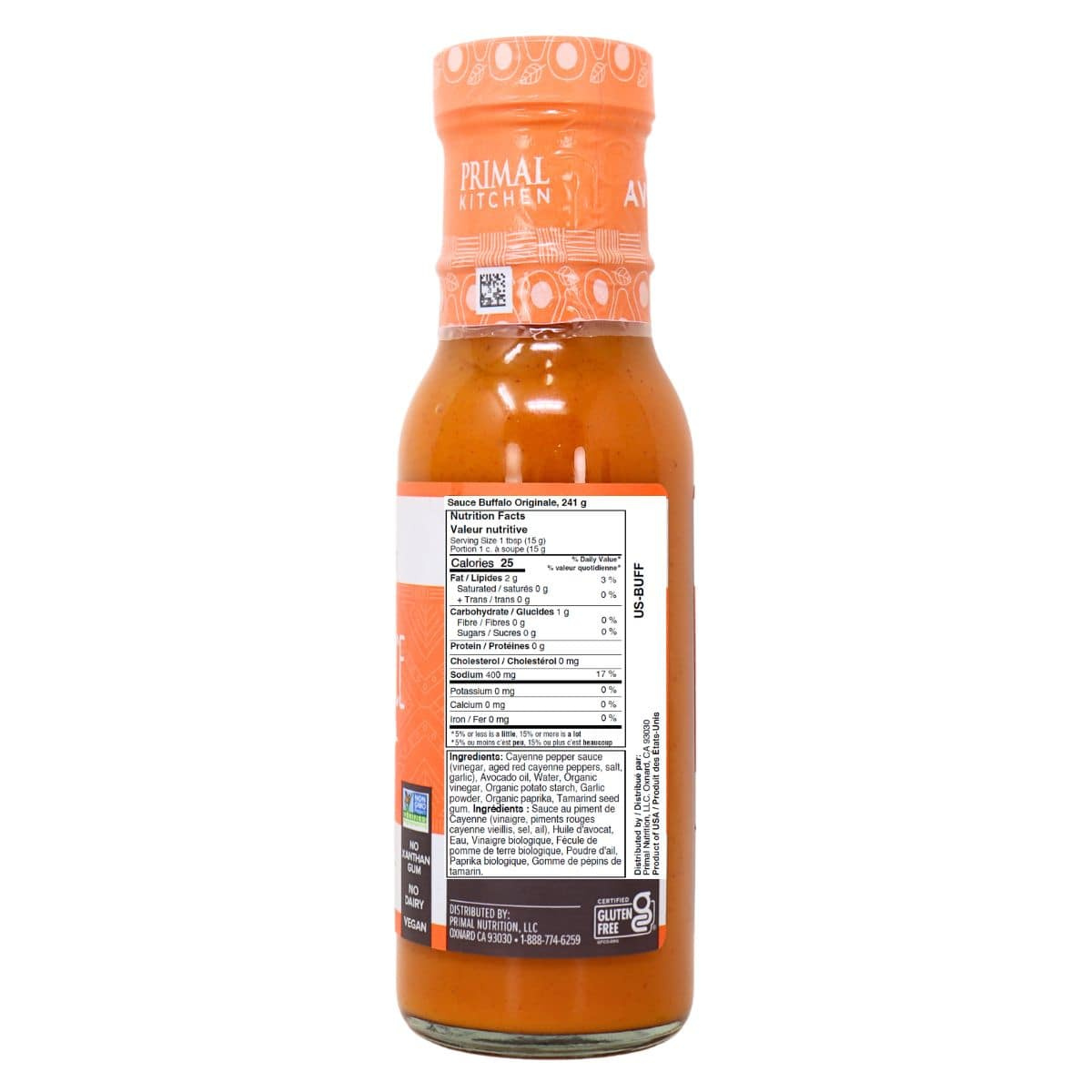 PRIMAL KITCHEN Buffalo Sauce? Game on! This snack-platter favourite gets a clean update with real ingredients like pumpkin seed butter and avocado oil. This Buffalo Sauce is free of xanthan gum and natural flavours and is Whole30 Approved, Keto Certified, vegan, and Certified Paleo. Made with simple, high-quality ingredients with integrity, like organic cayenne sauce and organic garlic powder, this sauce is a must-have for any pantry. Creamy and full of feisty flavour, serve up on savoury buffalo wings and craveable cauliflower bites. Dress up dips, spice up deviled eggs, or make your burger or burrito extra saucy.