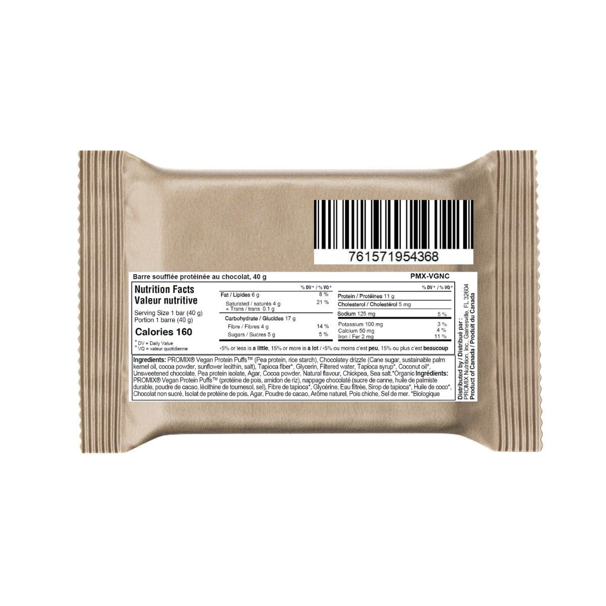 PROMIX Protein Puff Bar Chocolate, 40g - PROMIX® Vegan Protein Puffs™ (Pea protein, rice starch), Chocolatey drizzle (Cane sugar, sustainable palm kernel oil, cocoa powder, sunflower lecithin, salt), Tapioca fiber*, Glycerin, Filtered water, Tapioca syrup*, Coconut oil*, Unsweetened chocolate, Pea protein isolate, Agar, Cocoa powder, Natural flavour, Chickpea, Sea salt. *Organic