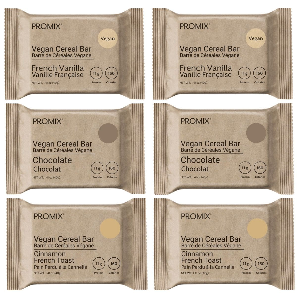 2 each of PROMIX Vegan Cinnamon French Toast, Vegan Chocolate, and Vegan French Vanilla Cereal Bars, 40 g each (6 bars total)