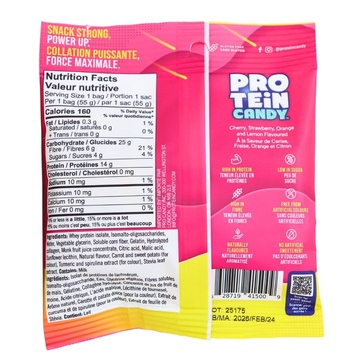 Meet Protein Candy's classic fruit candy, where your candy gets a serious upgrade. Made with whey and collagen protein, prebiotic fibre, and naturally sweetened with monk fruit juice and stevia, Protein Candy has a whopping 14g of protein, only 4g of sugar, and 6g of fibre! Bursting with the classic fruit flavours you love—Cherry, Strawberry, Orange, and Lemon—this high-protein, high-fibre, low-sugar candy is more than just a sweet treat. It’s the candy that proves you can have it all. Tastier, healthier, and just downright better, Protein Candy crushes the competition and your cravings!