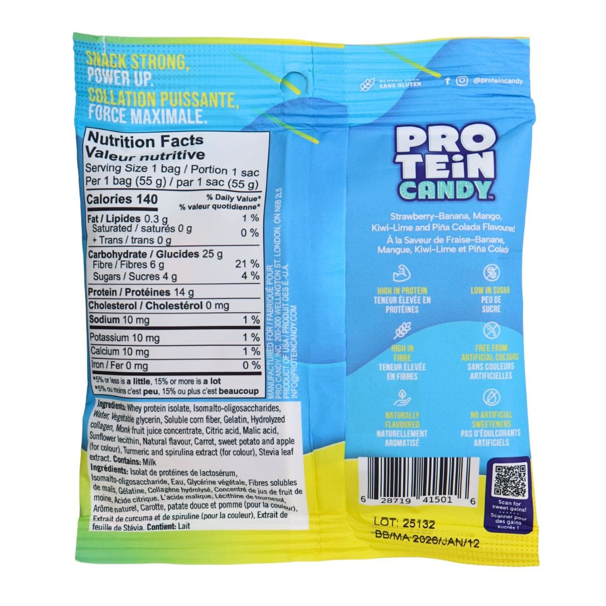 This isn’t just candy, it’s Protein Candy. Packed with 14g of protein from whey and collagen plus 6g of prebiotic fibre, these healthy candies are your delicious ticket to paradise! Because with all-natural tropical flavours like Strawberry-Banana, Mango, Kiwi-Lime, and Piña Colada, this high-protein, high-fibre candy is a sun-soaked beach getaway in every bite! And with only 4g of sugar, get ready to pack your bags (and your snack drawer) because the tropics are just a bite away with Protein Candy!