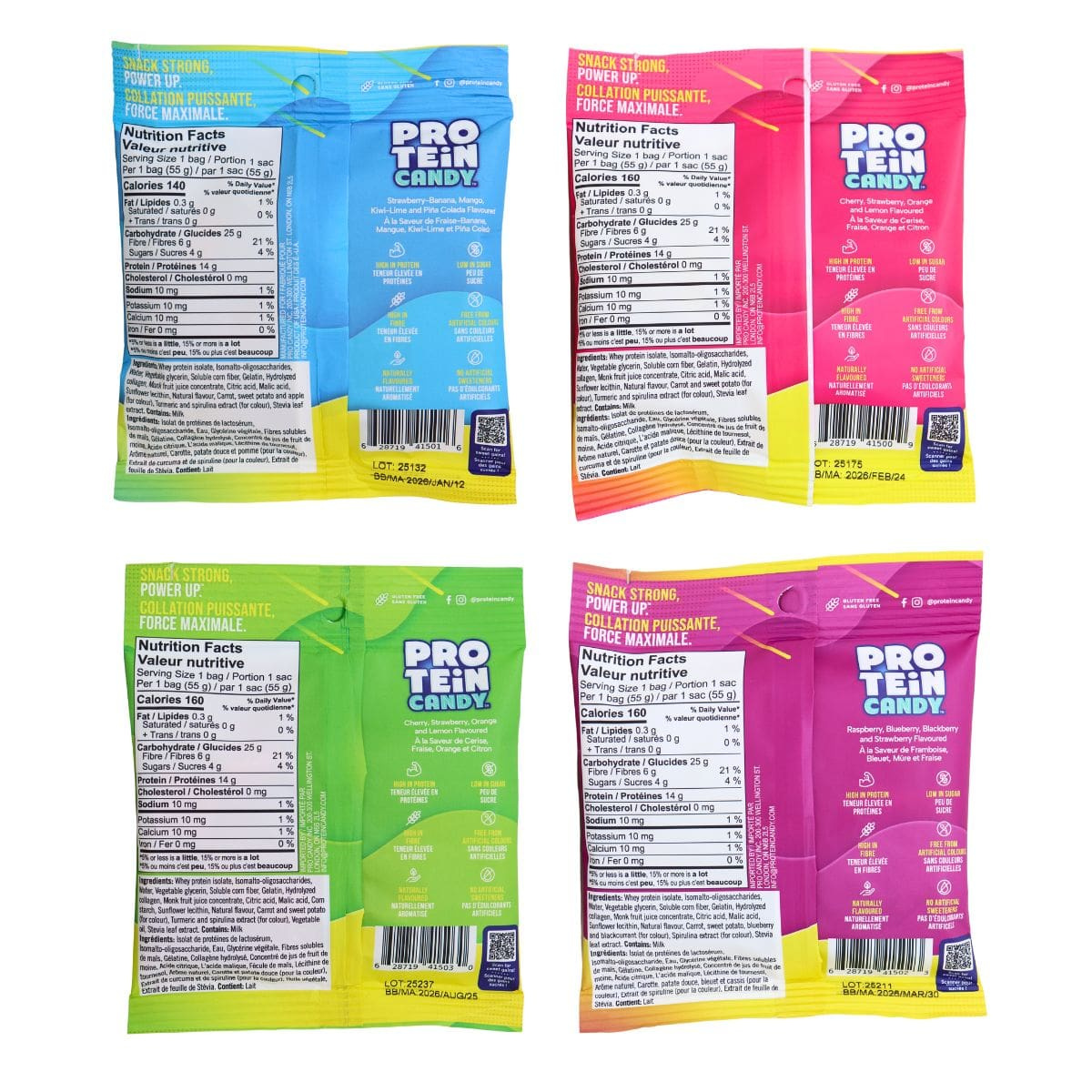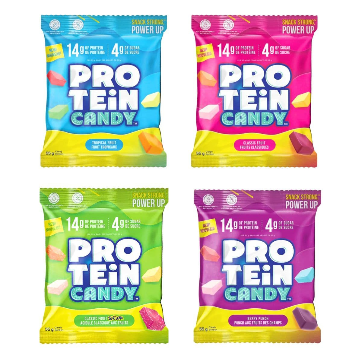 It’s a candy. It’s a gummy. It’s a chew. No, it’s Protein Candy! Soft and chewy, and a mix of all three, Protein Candy is here to crush your candy cravings and add a whole new meaning to “candy crush”! With all four delicious flavours, Classic Fruit, Classic Fruit Sour, Berry Punch and Tropical Fruit, this variety pack has something for every sweet tooth! Crafted with whey protein, hydrolyzed collagen, and sweetened with monk fruit and stevia, Protein Candy is packed with 14g of high-quality protein, 6g of prebiotic fibre, and only 4g of sugar, hitting that sweet spot of delicious and nutritious! How sweet is that?
