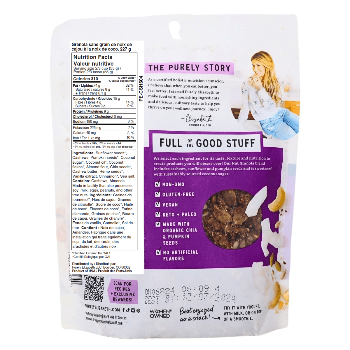 Organic Sunflower Seeds, Cashews, Organic Pumpkin Seeds, Organic Coconut Sugar, Organic Coconut Oil, Organic Coconut Flakes, Almond Flour, Organic Chia Seeds, Cashew Butter, Organic Hemp Seeds, Vanilla Extract, Organic Cinnamon, Sea Salt.