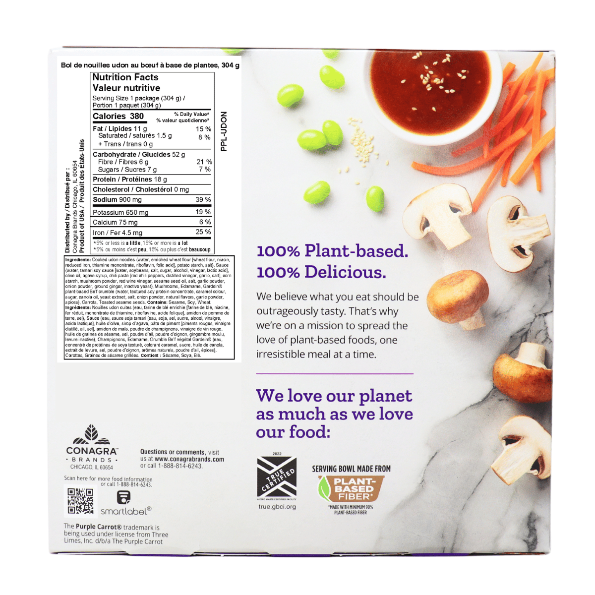 Cooked udon noodles (Water, enriched wheat flour [Wheat flour, niacin, reduced iron, thiamine mononitrate, riboflavin, folic acid], potato starch, salt), sauce (Water, tamari soy sauce [Water, soybeans, salt, sugar, alcohol, vinegar, lactic acid], olive oil, agave syrup, chili paste [Red chili peppers, distilled vinegar, garlic, salt], corn starch, mushroom powder, contains 2% or less of [Red wine vinegar, sesame seed oil, salt, garlic powder, onion powder, ground ginger, inactive yeast]), mushrooms, edamame, Gardein plant-based be'f crumble (Water, textured soy protein concentrate, contains 2% or less of [Caramel colour, sugar, canola oil, yeast extract, salt, onion powder, natural flavours, garlic powder, spices]), carrots, toasted sesame seeds.