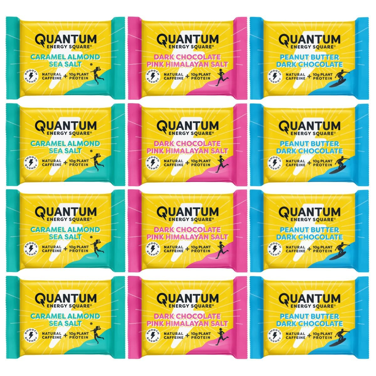 12 individual bars of Quantum Energy Bars: 4x Peanut Butter Dark Chocolate, 4x Dark Chocolate Pink Himalayan Salt, 4x Caramel Almond Sea Salt - all 45 g.