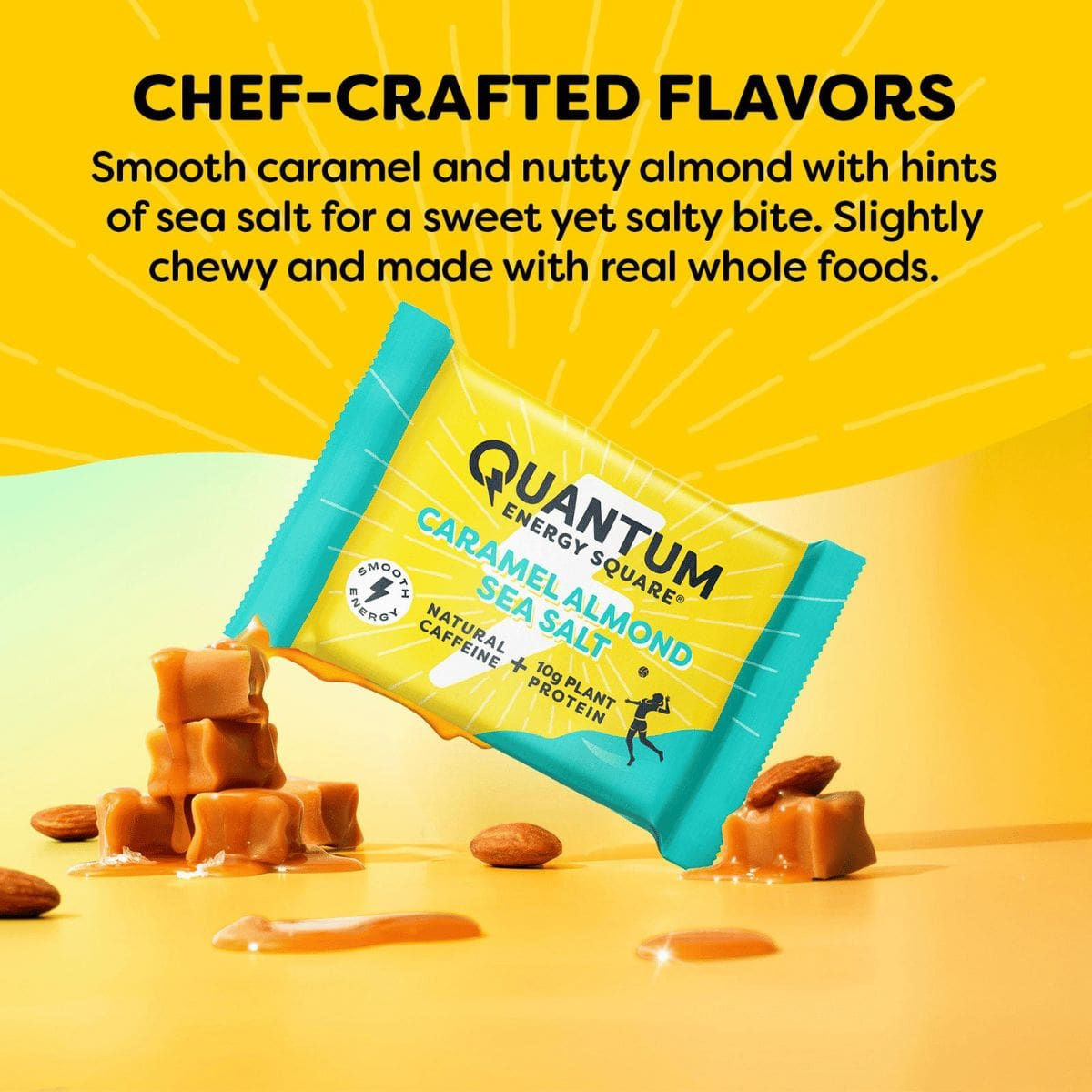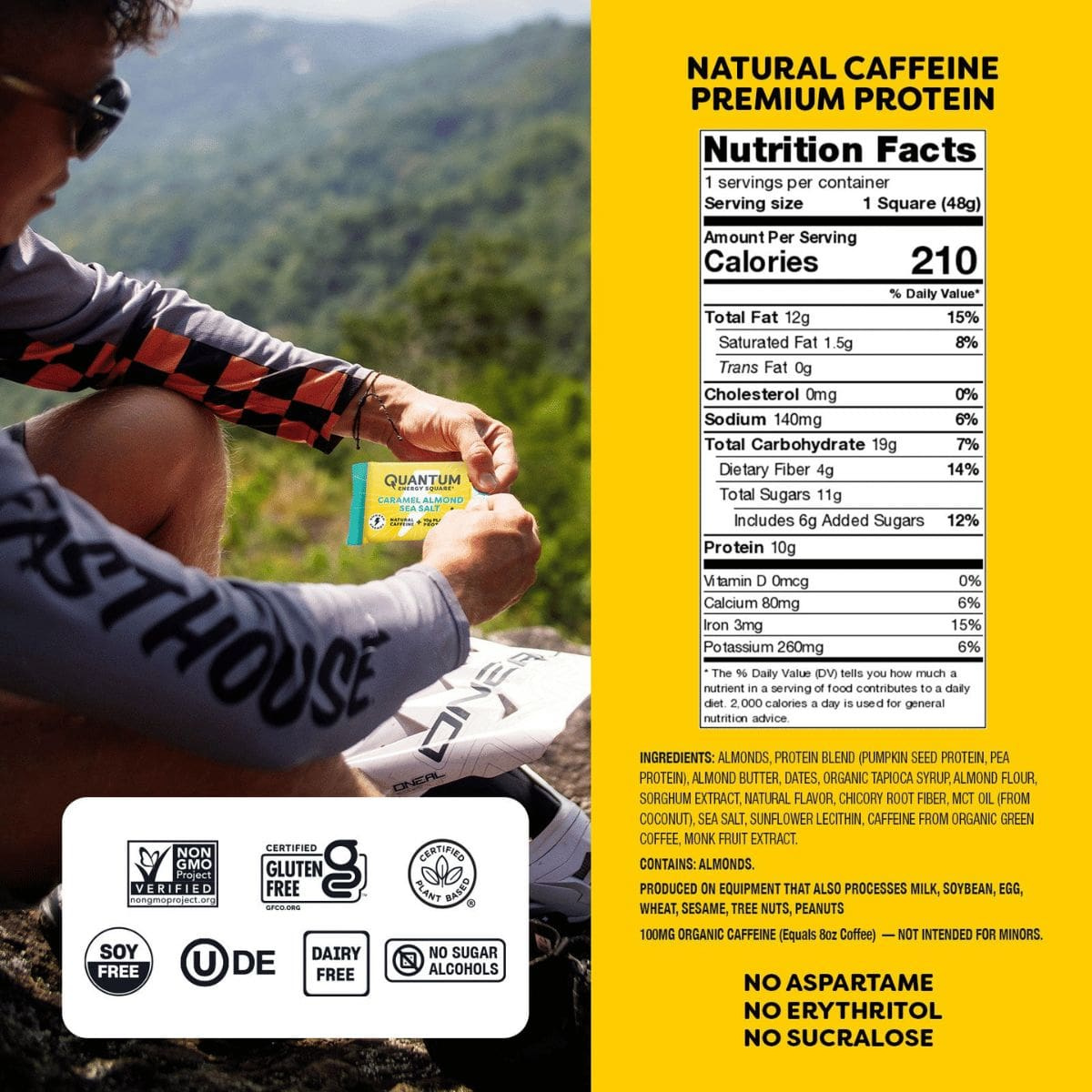 Quantum Energy Squares Caffeinated Protein Bar Caramel Almond Sea Salt, 45 g - Almonds, Protein blend (Pumpkin seed protein, pea protein), Almond butter, Organic tapioca syrup, Dates, Almond flour, Sorghum extract, Natural flavor, Chicory root fiber, MCT oil (From coconut), Sunflower lecithin, Sea salt, Caffeine (From organic green coffee), Monk fruit extract.