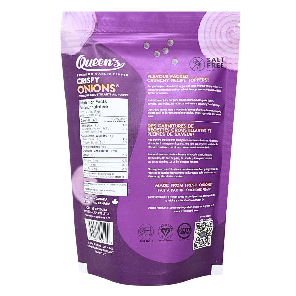 You don’t need to be royalty to enjoy the crispiest fried onions around–but you do need Queen’s Premium gluten-free crispy fried onions! With no flour coating, these vegan and keto-friendly fried onions are lightly seasoned with savoury garlic and a kick of black pepper–so you get a crunchy texture and bold flavours that are fit for a queen (or king!). Made with just four simple ingredients, whether you're sprinkling them on top of a juicy burger, or a creamy casserole, these crispy fried onions will transform any meal into a gourmet experience.