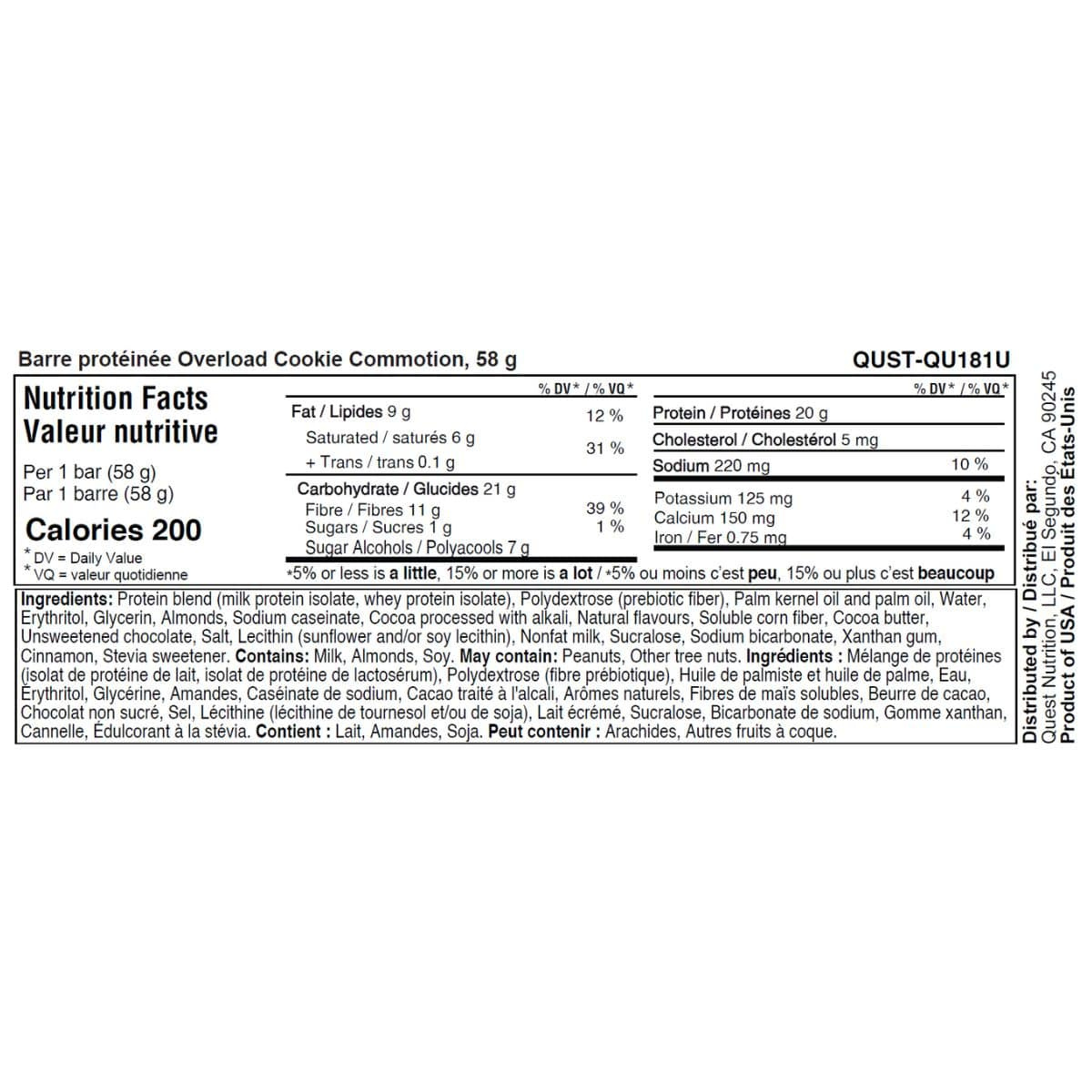 Sound the alarms! Quest protein bars are starting a cookie commotion that is breaking out, and you’re in the middle of a delicious disaster! Crumbs are flying as crunchy graham cookies, rich chocolate cookies, and buttery vanilla cookies collide in a chocolate chip cookie dough-flavoured base. Crashing into a layer of milk chocolatey coating and drizzled with white chocolate, Quest’s overload protein bars are seriously OVERLOADED with decadent deliciousness, elevating the classic cookie dough protein bar to unbelievable new heights. Packed with 20g of protein, with only 3 net carbs and 1g of sugar, these gluten-free protein bars are worth causing a commotion for!