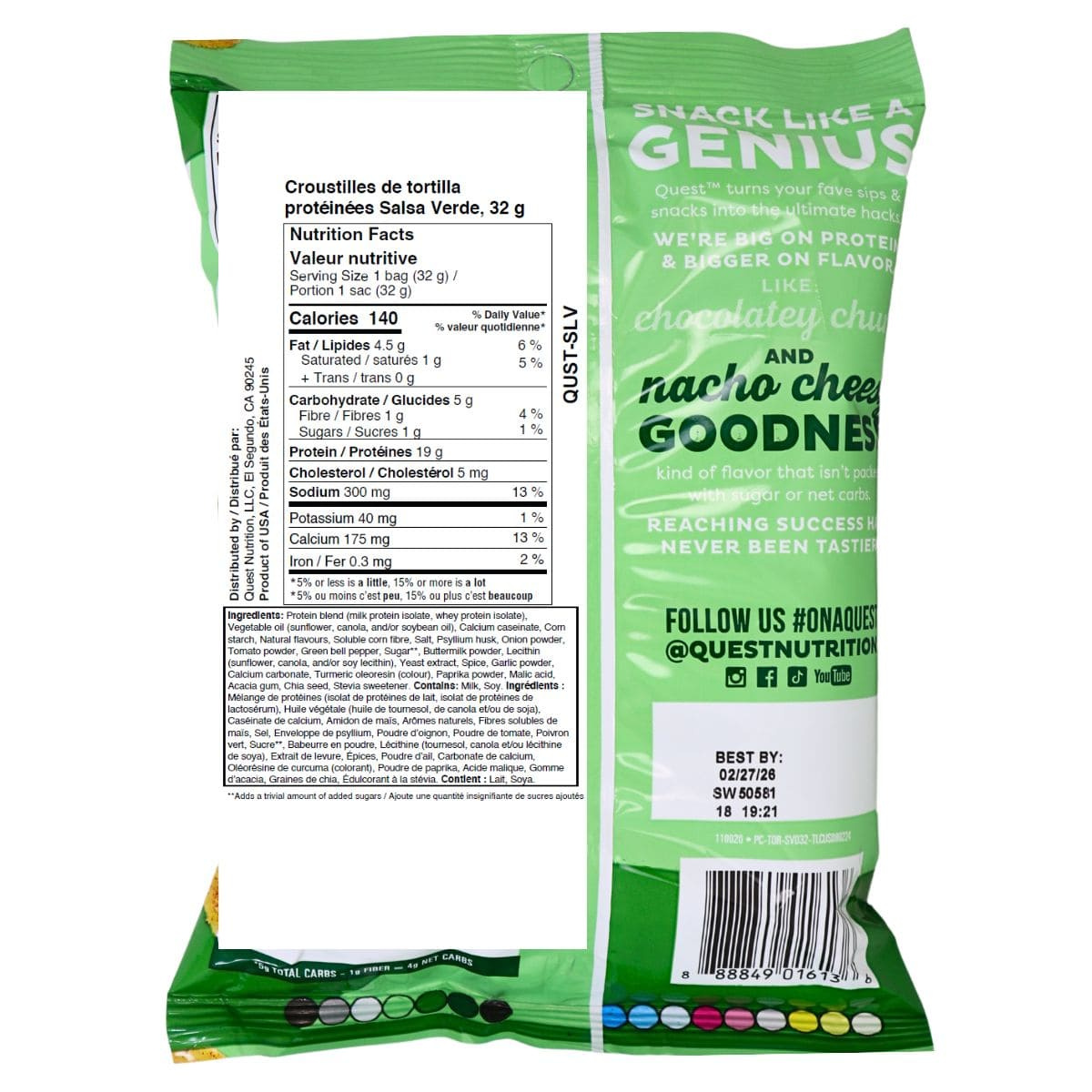 That bold, tangy, can’t-stop-crunching vibe of your favourite tortilla chips, now in a high protein low carb chip! Say hola to Quest's chips. These protein chips bring the fiesta with 19g of protein, and only 4g of carb and 1g of sugar. Zingy, savoury and packing a serious crunch, Quest's protein chips are baked, not fried, and captures all the flavours of an authentic salsa verde. Big on flavour, low on compromise. Now that’s how you chip smart!